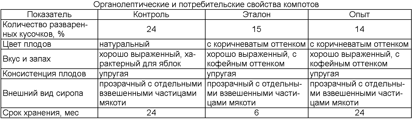 Изобретение относится к технологии производства консервированных компотов. Известен способ производства компота из яблок, предусматривающий подготовку рецептурных компонентов, приготовление на воде сахарного сиропа с содержанием сухих веществ 22-29%, фасовку яблок и сиропа, герметизацию и стерилизацию (Сборник технологических инструкций по производству консервов. Том II. Часть 2. – М.: АППП “Консервплодоовощ”, 1992, с.75-162). Недостатком этого способа является содержание в целевом продукте большого количества разваренных плодов. Данный способ позволяет получить компот со специфическим кофейным оттенком вкуса и аромата и несколько сократить содержание разваренных плодов в целевом продукте за счет замены стерилизации пастеризацией, но обладает усложненной технологией из-за необходимости декофеинизации экстракта и сокращенным сроком хранения целевого продукта. Техническим результатом изобретения является получение компота со специфическим кофейным оттенком вкуса и аромата при отсутствии в рецептуре кофе, упрощение технологии и сокращение содержания в целевом продукте разваренных плодов без уменьшения срока его хранения. Этот результат достигается тем, что в способе производства компота из яблок, предусматривающем подготовку рецептурных компонентов, приготовление сиропа на экстракте, фасовку яблок и сиропа, герметизацию и термообработку, согласно изобретению подготовленный тописолнечник нарезают, сушат в поле СВЧ до остаточной влажности около 20% при мощности поля СВЧ, обеспечивающей разогрев тописолнечника до температуры внутри кусочков 80-90°C, в течение не менее 1 часа, обжаривают и измельчают, подготовленное зерно ячменя и ржи обжаривают, смешивают тописолнечник, зерно ячменя и зерно ржи в соотношении по массе 2:2:1, экстрагируют полученную смесь питьевой водой при соотношении фаз 1:(6-7) и периодическом сбросе давления в экстракционной смеси до вскипания воды, отделяют соответствующий экстракт и фильтруют его, сироп готовят с содержанием сухих веществ 22-29%, а термообработку осуществляют до достижения промышленной стерильности. Способ реализуется следующим образом. Рецептурные компоненты подготавливают по традиционной технологии. Подготовка яблок в зависимости от вида приготавливаемого компота может включать, помимо инспекции и мойки, вырезание сердцевины или резку с одновременным удалением плодоножки и семенной камеры и/или очистку от кожицы. Подготовленный тописолнечник нарезают и сушат в поле СВЧ до остаточной влажности около 20% в течение не менее 1 часа. При этом по известным зависимостям (Губиев Ю.К. Научно-практические основы теплотехнологических процессов пищевых производств в электромагнитном поле СВЧ. Автореферат дис. д.т.н. – М.: МТИПП, 1990, с.7-11) рассчитывают значения мощности поля СВЧ, позволяющие обеспечить время сушки тописолнечника 1 час и разогрев до температуры внутри кусочков 80 и 90°C. Мощность поля СВЧ задают больше или равной второму значению и меньше или равной меньшему из первого и третьего значений рассчитанных мощностей. Сушка в поле СВЧ при температуре выше 90°C приводит к преждевременной карамелизации сахаров. Сушка в поле СВЧ при температуре ниже 80°С и сокращение времени сушки менее 1 часа приводят к сокращению выхода экстрактивных веществ. Поскольку увеличение времени сушки автом