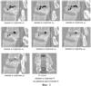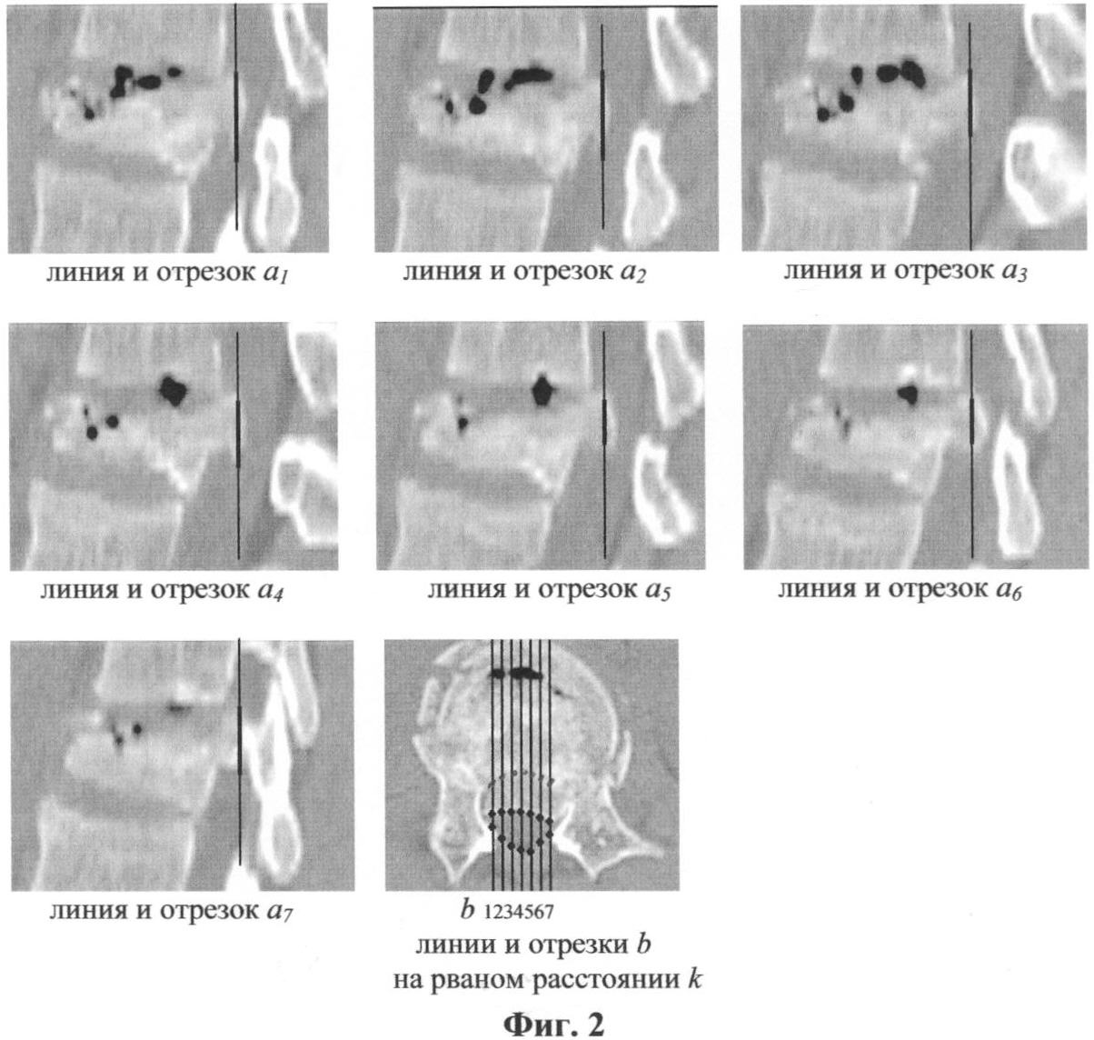 На Фиг.2 изображены продольные и аксиальные снимки поврежденного позвонка с построением линий и отрезков на них по контуру дефекта позвоночного канала.