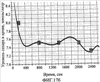 Фигура 11. Результаты теста толерантности к глюкозе (“Сахарная кривая”) на практически здоровом пациенте (первый график на фигуре 10.). Кривая красного цвета – временная динамика уровня сахара в крови, зарегистрированная в режиме мониторинга, с помощью опытного прибора; результаты измерений, сделанных с помощью прибора “Accu Chek Active”, показаны квадратами серого цвета. Момент приема сахарной нагрузки отмечен стрелкой.