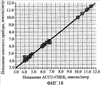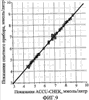 Фигура 9. График корреляции показаний опытного прибора с показаниями стандартного глюкометра по результатам 15 экспериментов, проведенных на одном практически здоровом испытуемом. Для контрольных измерений использовался глюкометр “Accu Chek Active”. Общее число контрольных измерений по пробам крови в 15 экспериментах составляет 38 измерений. Все измерения сделаны с одной калибровкой. Показания опытного прибора, в моменты времени, соответствующие моментам времени контрольного измерения по пробам крови из пальца, совпадают с показаниями сертифицированного глюкометра с точностью 1-2%, определяемой погрешностью последнего. Характерные результаты таких экспериментов, сделанных в разное время в течение дня, а также в разные дни, представлены на Фигурах 10-14.