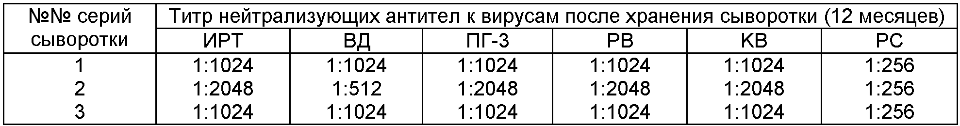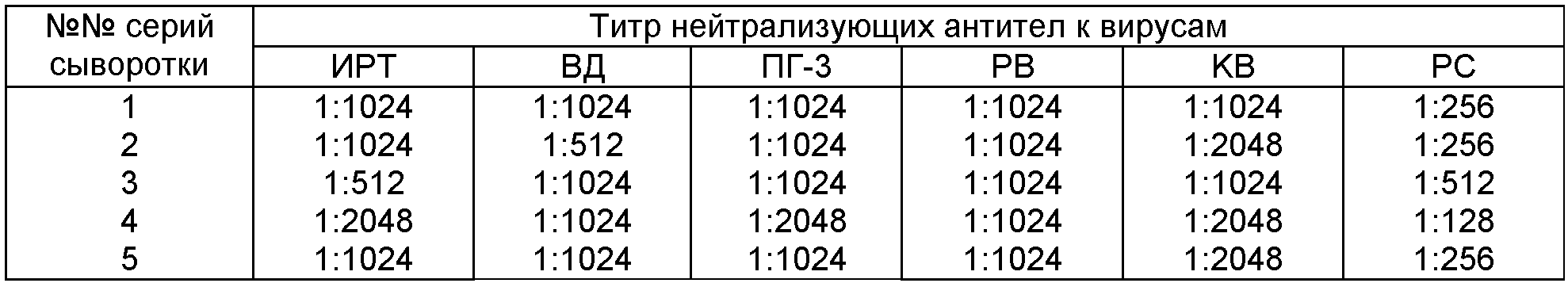 Гипериммунная поливалентная сыворотка против инфекционного ринотрахеита, вирусной диареи, парагриппа-3, рота-, корона- и респираторно-синцитиальной инфекции крупного рогатого скота, характеризующаяся тем, что содержит специфические антитела против вирусов инфекционного ринотрахеита, парагриппа-3, рота- и коронавирусной инфекции в титре 1:1024-1:2048, вирусной диареи в титре 1:512-1:1024, респираторно-синцитиальной инфекции в титре 1:256.