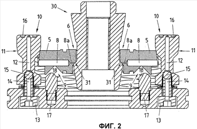 На фиг.2 показан продольный разрез фиксирующего механизма 2 согласно фиг.1 вместе с зажимной втулкой 30. На этом изображении, на котором показан поршень 3 в его нижнем конечном положении, т.е. в положении фиксирования, видно, что соответствующий фиксирующий штифт 10 своей поверхностью 11 прижатия оказывает давление на соответствующий зажимной элемент 5 в радиальном направлении наружу в его положение фиксации. В этом положении фиксации соответствующий зажимной элемент 5 своей торцевой стороной прилегает по плоскости к проходящему по периметру в виде кольца, выполненному в виде выступа 31 зажимной поверхности зажимной втулки 30. Далее, видно, что соответствующий зажимной элемент 5 снабжен сквозным отверстием 8, которое проходит от задней стороны в продольном направлении через весь зажимной элемент 5 и выходит на передней стороне из головной части 6 в виде отверстия 8а меньшего диаметра. Если соответствующий зажимной элемент 5 в положении фиксации прилегает по плоскости к выступу 31 зажимной втулки 30, то сквозное отверстие 8 на передней стороне перекрывается зажимной втулкой 30. Далее, можно видеть, что соответствующий зажимной элемент 5 на своей нижней стороне снабжен конической выемкой 9, в которую входит своей сходящейся на конус передней стороной соответствующий штифт 17 раскрытия при движении вверх таким образом, что соответствующий зажимной элемент 5 перемещается радиально наружу, и фиксация снимается. Наконец, можно видеть, что соответствующий фиксирующий штифт 10 закреплен посредством винта 13 на поршне 3. Как фиксирующий штифт 10, так и винт снабжены сквозным отверстием 12, 14. Между сквозным отверстием 14 винта 13 и отверстием фиксирующего штифта 10 расположен действующий в качестве обратного клапана шарик 15, функции которого поясняются ниже более подробно.