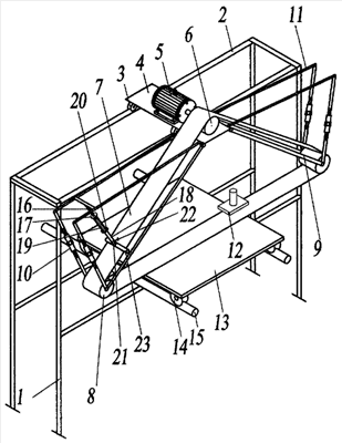 Станок работает следующим образом. При обработке детали последняя укладывается на пластину 13 механизма подачи обрабатываемого материала и подводится под шлифовальную ленту 7 перемещением на роликах 14 по направляющим 15 в поперечном направлении. Продольным перемещением рамы 4 на роликах 3 по направляющим 2, закрепленным на станине 1, место обработки детали подводится под прижим 12 и при воздействии последнего на ленту 7 происходит трение ее образива о поверхность обработки. Лента 7, отрегулированная на «холостом ходу» (без воздействия прижима 12), при вращении приводом 5 приводного шкива 6 обегает без смещения и проскальзывания последней и ведомые шкивы 8, что обеспечивается установкой последних под определенным углом к ленте 7 посредством изменения угла установки шарнирно закрепленных на раме 4 рычагов 9 при изменении длины тальрепов 10, соединенных с жестко закрепленными на раме 4 соответствующими траверсами 11. В рабочем режиме (воздействует прижим 12) при поперечном относительно ленты 7 перемещении обрабатываемой детали происходит некоторое смещение ленты 7 на шкивах 6 и 8. Полного сбегания ленты не происходит, однако там, где лента 7 сходит одной стороной со шкивов 6 или 8, происходит ее быстрый продольный разрыв. Абсолютно точно настроить ленту 7 по середине шкивов 6 и 8 невозможно, и обычно в практике при настройке остается тенденция преимущественного сбегания в какую-либо одну сторону. В процессе износа ленты 7 и значительных нагрузках происходит удлинение последней, возникает проскальзывание ее на ведущем шкиву 6 (особенно на узких лентах) и требуется дорегулировка, что достаточно трудоемко осуществить тальрепами 10.