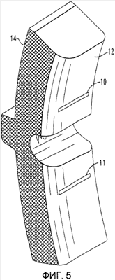 Назначение композиционной железнодорожной тормозной колодки заключается в создании тормозного усилия в форме трения, создающего тормозящее усилие на поверхностях качения колес железнодорожного вагона. Как показано на фиг.1-5, тормозная колодка представлена структурой, состоящей обычно из дугообразного блока, снабженного одной фрикционной поверхностью 12, прилегающей к окружности колеса, и радиально отделенной от нее задней поверхностью 14, которая должна устанавливаться на опорном элементе тормозной системы, который прикладывает усилие к тормозной колодке во время торможения. Между фрикционной поверхностью 12 и задней поверхностью 14 располагаются боковые поверхности 16. Тормозная колодка может включать в себя металлическую опорную пластину, помещенную на задней поверхности или встроенную в нее с целью прикрепления к опорному элементу тормозной системы. Тормозная колодка может включать в себя металлические вставки 10 и 11, которые выступают сквозь слой композиционного материала для улучшения износостойкости или требуемого состояния поверхности колеса и/или для улучшения сцепления при качении между колесом вагона и рельсами.