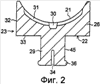 Главный участок 26 подложки имеет цилиндрическую наружную периферическую поверхность 32 в дополнение к вогнутой поверхности 21 и воспринимающей давление поверхности 22. Воспринимающая давление поверхность 22 состоит из кольцеобразной перпендикулярной воспринимающей давление поверхности 33, которая является перпендикулярной к направлению сжимающей силы F. Подложка 23 направляющего приспособления для зубчатой рейки имеет также на другом конце вспомогательного участка 29 крестовидную прорезь 34 для облегчения упругой деформации другого конца вспомогательного участка 29, чтобы тем самым облегчить введение вспомогательного участка 29 в сквозные отверстия 27 и 28, а также выпяченный участок 36, который входит в зацепление с кольцеобразным ступенчатым участком 35 сжимающего элемента 25 для предотвращения того, чтобы вспомогательный участок 29 выходил из сквозного отверстия 28 сжимающего элемента 25. Продолговатый нижний паз 30 является более широким и глубоким, чем перпендикулярный продолговатый паз 31.