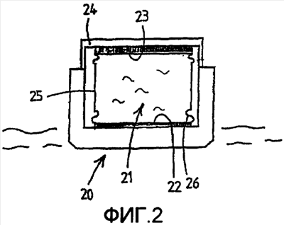 На фиг.2 показано судно 20 с танком 21 для перевозки, размещенным в корпусе упомянутого судна. На нижней стороне танк 21 соединен посредством днища 22 танка с днищем корпуса судна. На верхней стороне танка крыша 23 танка 21 свешивается с верхней палубы 24 корпуса судна. Стенка танка также представляет собой цилиндрическую окружную стенку 25 танка. В стенке танка заключены компенсаторы 26 деформаций, выполненные в данном случае в виде сильфонных компенсаторов деформаций с двумя гофрами, проходящими в осевом направлении. Гофры проходят с каждой стороны от воображаемой плоскости, проходящей через окружную стенку 25 танка. Это обеспечивает преимущество, заключающееся в том, что компенсатор деформаций располагается симметрично относительно окружной стенки 25 танка, так что в положении, где находится компенсатор деформаций, не возникает результирующая сила, обусловленная давлением жидкости и направленная вниз. Отдельные опорные элементы здесь не показаны.