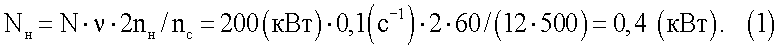 Например, для исходного судового синхронного генератора СГ-200, развивающего мощность 200 кВт при числе оборотов в минуту n=500, в случае качаний на угол =±15° (1/12 полного оборота) при средней частоте бортовых качаний шлюпки 6 раз в минуту ( =0,1 Гц) и 2-х ее перекладках за одно качание мощность Nн такой системы составит величину (1)
