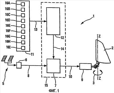 Электрическая система 1 управления, в соответствии с настоящим изобретением, схематически представленная на фиг.1, предназначена для приведения в действие руля 2 направления летательного аппарата, который установлен с возможностью поворота в двух направлениях вокруг вертикальной оси Z-Z таким образом, который символически изображен двойной стрелкой 3. Упомянутый руль, поверхность 2 направления, может принимать любое угловое положение вокруг упомянутой оси Z-Z внутри диапазона перемещения, который тянется по ту или другую сторону аэродинамически нейтрального положения упомянутого руля 2 направления, и который ограничен первым пределом перемещения L1 и вторым пределом перемещения L2.
