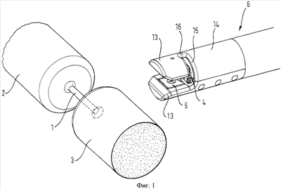 Оба зажимающих инструмента 4, 5 расположены в совместном, образованном инструментом 6 для наложения клипсов, направляющем устройстве, которое имеет корпус, в примере осуществления изобретения с Фиг.1-7 корпус, к примеру корпус в форме кругового цилиндра. Представленные на чертежах примеры осуществления инструмента 6 для наложения клипсов имеют продолговатую форму, в частности форму стержня.