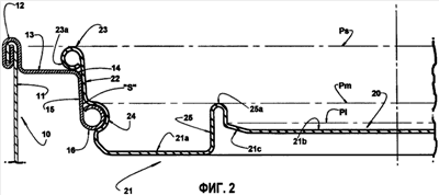 В проиллюстрированном варианте реализации кольцевая реберная часть 25 имеет верхнюю кромку 25а, расположенную в плоскости Pm (фиг.2), которая пересекает боковую стенку 22 крышки 20 обычно в области ее периферийного углубления 24 в тех конструкциях, в которых боковая стенка 22 имеет непрерывное периферийное углубление 24 типа, предназначенного для вмещения непрерывного кольцевого пояска16 отходящего трубчатого выступа 15 верхней кольцевой стенки 13 банки 10. В проиллюстрированном варианте реализации периферийная кольцевая часть 21а и срединная часть 21b нижней стенки 21 крышки 20 являются плоскими, причем указанная срединная часть 21b нижней стенки 21 располагается в плоскости, которая несколько ниже плоскости Pi (фиг.2), содержащей свободный нижний край прилегающей боковой ножки кольцевой реберной части 25, причем указанная срединная часть 21b представляет крайний кольцевой участок 21с, наклоненный вверх и наружу для совмещения с указанным свободным нижним краем кольцевой реберной части 25.