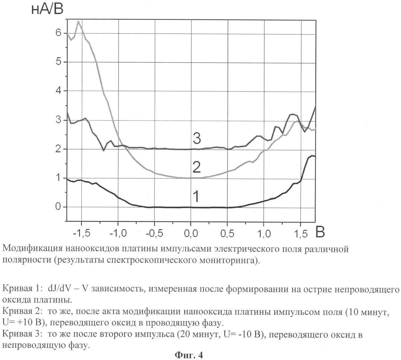 Изменяя полярность импульсов напряжения, можно проводить обратимую модификацию электронного строения нанооксидов – их перевод из непроводящей фазы в проводящую и обратно (см. фиг.4).
