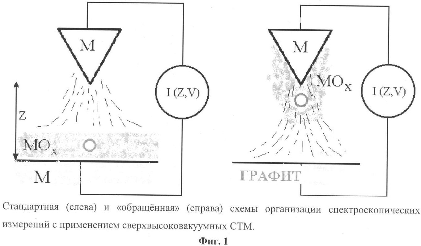 Изображение на фиг.1 слева приведено для пояснения “стандартной” схемы организации спектроскопических измерений с применением СТМ, которая предусматривает расположение анализируемой металлооксидной наноструктуры (МОх) под металлическим острием СТМ на проводящей металлической (М) поверхности. На фиг.1 справа изображение поясняет “обращенную” схему организации экспериментов с СТМ, которая соответствует «нанолаборатории». Такая схема предусматривает синтез и расположение анализируемой металлооксидной наноструктуры (МОх) непосредственно на металлическом (М) острие, в зависимости от полярности напряжения испускающем (при V<0) или принимающем (при V>0) электроны, а в качестве токопроводящей поверхности используется химически инертная поверхность бездефектного участка (0001)-грани графита.