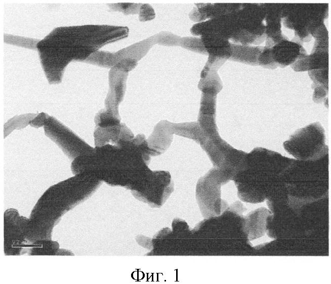 На фиг.1 представлено электронно-микроскопическое изображение нановолокнистых карбидов кремния, полученных в опыте 3 из шунгитовых пород Залебяжского месторождения.