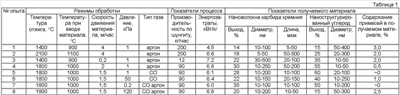 Процесс проводили в термокамере диаметром 250 мм, высота зоны высокотемпературной термообработки составляла 1.0 м, высота зоны охлаждения 1.4 м. В качестве кремний- и углеродсодержащего материала при тестовых испытаниях способа были использованы шунгитовые породы Залебяжского месторождения (Карелия, Россия) с содержанием углерода около 40%. Дисперсность материала составляла 1,2-0,15 мм-1 Характеристики конкретных опытов суммированы в таблице.