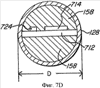 Цилиндрическая конфигурация вкладыша 158 выполнена так, чтобы внешний диаметр d (Фиг.7В), плотно прилегал к внутреннему диаметру D (Фиг.7D) оболочки детонатора 128. Это облегчает производственный процесс, потому что вкладыш цилиндрической формы 158 с большей легкостью вставляется во внутреннюю часть оболочки 128, чем немонолитное устройство задержки, такое как изображенное на Фиг.6, 6А и 7А. (Очевидно, вставка устройства задержки и других компонентов происходит прежде, чем формируются бортики 128с (Фиг.6) для фиксации на месте ударной трубы 132). Вкладыш 158 также увеличивает механическую прочность устройства задержки 710 и защищает его во время обработки в производственном процессе и во время транспортировки, если оно транспортируется до его вставки во взрывное устройство.