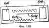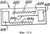 На Фиг.11 и 11A-11C схематично показан другой вариант реализации поточной линии для производства варианта реализации устройств задержки изобретения и конечного продукта. Вариант реализации на Фиг.11A-11C показывает производственный метод изобретения, в котором мостиковая полоса наносится на подложку в выбранном месте и конфигурации, чтобы замкнуть разрыв, то есть конечный зазор, сделанный в первоначально нанесенном участке полосы настройки времени задержки, и обеспечивает выбранную полезную длину полосе настройки времени задержки. Бесконечная конвейерная лента 146 перемещает множество подложек 612 последовательно мимо первой пары печатающих головок 148а, 148b, которая наносит на подложку 612 калибровочную полосу 620 и неполную полосу настройки времени задержки 614 (Фиг.11C), состоящую из первой полосы 614х и второй полосы 614у. Печатающая головка 148а содержит компонент топлива, например пасту, содержащую топливные частицы, а печатающая головка 148b содержит компонент окислителя, например пасту, содержащую частицы окислителя. Компоненты топлива и окислителя могут отдельно обрабатываться, храниться и наноситься, таким образом избегая необходимости обработки, хранения и нанесения опасной реакционной смеси топлива и окислителя. В соответствии с этой практикой компоненты топлива и окислителя контактируют друг с другом только в ходе, или, предпочтительно, после нанесения на подложку. Калибровочная полоса 620 наносится между воспламеняющим элементом начала калибровки 622 и воспламеняющим элементом конца калибровки 624. Один конец первой полосы 614х контактирует с устройством приема входного сигнала 616, а один конец второй полосы 614у контактирует с устройством передачи сигнала 618. Одно или больше устройств 616, 618, 622 и 624 может наноситься на подложку 612 или до, или после, или одновременно с прохождением подложкой 612 под первой парой печатающих головок 148а, 148b.