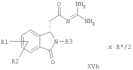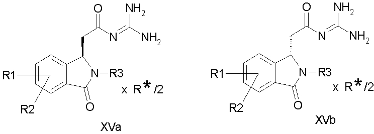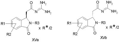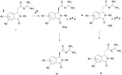 Поэтому представляло большой интерес разработать региоселективный способ получения производных (3-оксо-2,3-дигидро-1H-изоиндол-1-ил)-ацетилгуанидина, а также способ получения энантиомеров. Улучшенное, региоселективное получение рацемических производных (3-оксо-2,3-дигидро-1H-изоиндол-1-ил)-ацетилгуанидина достигается двумя независимыми путями, представленными на схеме 1 и схеме 3. Разделение рацематов достигается путем кристаллизации в виде солей 2,3-O-ацилированных D- или L-винных кислот, как представлено на схеме 5. Посредством щадящей катализируемой основанием рацемизации нежелательных в данном случае энантиомеров возможно значительное превращение рацемата в желаемый энантиомер. Названные способы делают возможным простое получение энантиомерно обогащенных или энантиомерно чистых производных (3-оксо-2,3-дигидро-1H-изоиндол-1-ил)-ацетилгуанидина. С помощью новых способов в настоящее время возможно простое получение больших количеств соединений формулы I в промышленном масштабе.