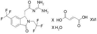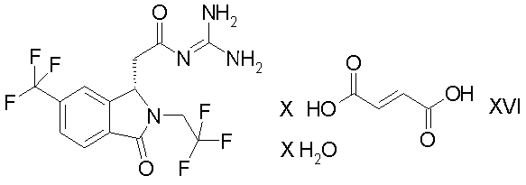 (S)-N-{2-[3-оксо-2-(2,2,2-трифторэтил)-6-трифторметил-2,3-дигидро-1H-изоиндол-1-ил]-ацетил}-гуанидин (соединение включения с 0,5 эквивалентами 2-пропанола, (M=412,3), 110 г, 266 ммоль) растворяют в диметоксиэтане (2 л) и смешивают с раствором фумаровой кислоты (0,5 M в смеси диметоксиэтан/вода 9:1, 512 мл) и образованный прозрачный раствор выпаривают под вакуумом. Остаток смешивают с дихлорметаном (2 л), и смесь вновь выпаривают под вакуумом. Остаток суспендируют в воде (1,5 л), отсасывают при комнатной температуре и в течение ночи сушат на воздухе при комнатной температуре. Получают 125,9 г (95%) (S)-N-{2-[3-оксо-2-(2,2,2-трифторэтил)-6-трифторметил-2,3-дигидро-1H-изоиндол-1-ил]-ацетил}-гуанидин гидрогенфумарат гидрата в виде бесцветных кристаллов. Т.пл. 210°C.