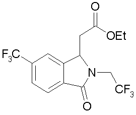 К суспензии 2-((E)-2-этоксикарбонил-винил)-4-трифторметил-бензойной кислоты (2,9 г, 10,1 ммоль) в толуоле (30 мл) добавляют при комнатной температуре SOCl2 (1,98 г, 27,2 ммоль). Перемешивают 5 мин при комнатной температуре и затем нагревают в течение 30 мин до 105°C (температура бани). Примерно при 70°C начинается газовыделение. Перемешивают 3 ч при 105°C, затем охлаждают до комнатной температуры и отсасывают через слой кизельгура (2,5 (0,5 см), промывают толуолом и фильтрат выпаривают под вакуумом. Получают хлорангидрид в форме красно-коричневого масла (3,34 г). 2,2,2-трифторэтиламин (1,2 г, 12,1 ммоль) и триэтиламин (2,58 г, 25,3 ммоль) растворяют в дихлорметане (15 мл) при 5°C и при охлаждении льдом прикапывают хлорангидрид, растворенный в дихлорметане (20 мл), с такой скоростью, что температура сохраняется между 5°C и 10°C. Затем баню со льдом удаляют, и избыток трифторэтиламина и часть дихлорметана отгоняют под легким вакуумом. Затем смесь 10 ч нагревают до кипения с обратным холодильником. После охлаждения смесь разбавляют дихлорметаном (50 мл) и дважды встряхивают с водным раствором 2N HCl (по 50 мл), объединенные органические фазы промывают водой (100 мл), сушат над Na2SO4 и выпаривают под вакуумом. Получают этиловый эфир (RS)-(2-(2,2,2-трифторэтил)-3-оксо-6-трифторметил-2,3-дигидро-1H-изоиндол-1-ил)-уксусной кислоты (3,51 г, 94%) в виде темно-коричневого масла, которое очищают кристаллизацией из н-гептана. Т.пл.: 54,5-55,5°C.