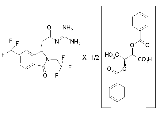 (S)-N-{2-[3-оксо-2-(2,2,2-трифторэтил)-6-трифторметил-2,3-дигидро-1H-изоиндол-1-ил]-ацетил}-гуанидин, соль O,O -дибензоил-L-винной кислоты (113 мг, 0,20 ммоль) растворяют в смеси из воды (1 мл) и этилацетата (5 мл) и добавляют раствор NaHCO3 (50 мг) в воде (7,5 мл). Смесь перемешивают 16 ч при комнатной температуре и затем трижды экстрагируют этилацетатом (по 5 мл). Объединенные органические фазы один раз встряхивают с раствором NaHCO3 (50 мг) в воде (20 мл) и затем с чистой водой (20 мл), сушат Na2SO4 и выпаривают в вакууме. Получают 75 мг (97%) (S)-N-{2-[3-оксо-2-(2,2,2-трифторэтил)-6-трифторметил-2,3-дигидро-1H-изоиндол-1-ил]-ацетил}-гуанидина. Продукт кристаллизуется из 2-пропанола в виде соединения включения с 0,5 эквивалентами 2-пропанола, т.пл.: 80-82°C. Вещество также может быть перекристаллизовано из этилацетата и кристаллизовано с 0,5 эквивалентами этилацетата, т.пл.: 121,5-122°C.