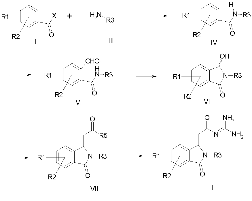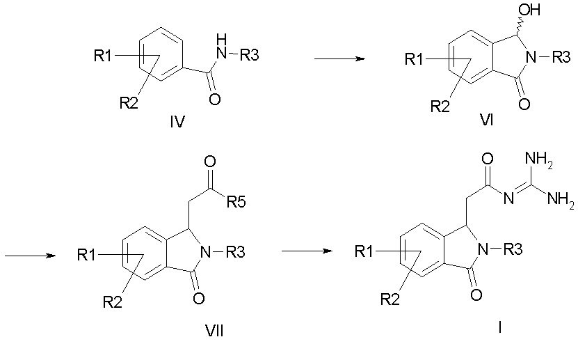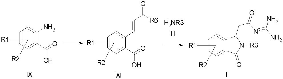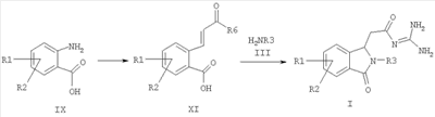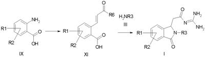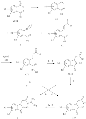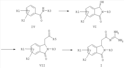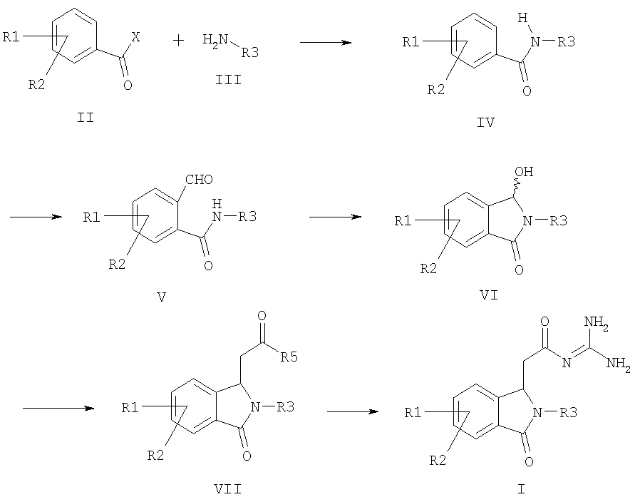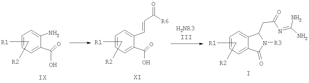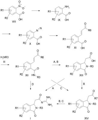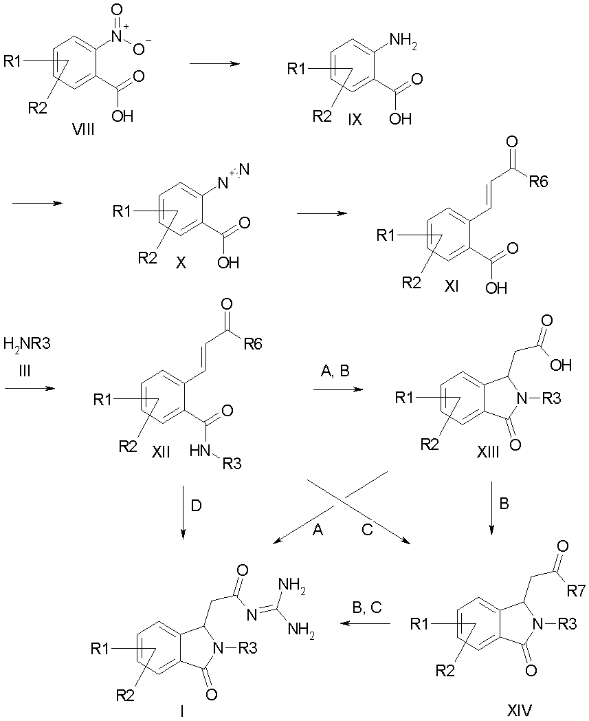a) нитросоединение формулы VIII подвергают каталитическому восстановлению до амина формулы IX, b) амин формулы IX подвергают диазотированию с получением соли диазония формулы X, c) соль диазония формулы Х без ее выделения подвергают превращению с С1-4 алкиловым эфиром акриловой кислоты с получением производного коричной кислоты формулы XI, d) соединение формулы XI подвергают амидированию амином формулы III H2NR3 с получением амида формулы XII и e) соединение формулы XII подвергают превращению с получением ацилгуанидина формулы I, или путем циклизации соединения формулы XII в присутствии сильного основания в производное изоиндолона формулы XIII, которое активируют для получения соответствующего хлорангидрида и затем превращают с гуанидином в изоиндол формулы I (вариант А), или путем циклизации соединения формулы XII в присутствии сильного основания в производное изоиндола формулы XIII, которое затем превращают в сложный эфир формулы XIV и затем путем взаимодействия с гуанидином превращают в изоиндол формулы I (вариант В), или путем превращения соединения формулы XII в присутствии сильного основания и спирта, такого, как метанол или этанол, в сложный эфир формулы XIV и затем путем превращения с гуанидином получают изоиндолон формулы I (вариант С), или путем циклизации соединения формулы XII в присутствии сильного основания при одновременном гуанилировании получают изоиндол формулы I (вариант D), причем в соединениях формул VIII, IX, X, XI, XII, XIII и XIV R1-R3 имеют значения, как в формуле I, и R6 и R7 независимо друг от друга обозначают алкокси с 1, 2, 3 или 4 С-атомами.