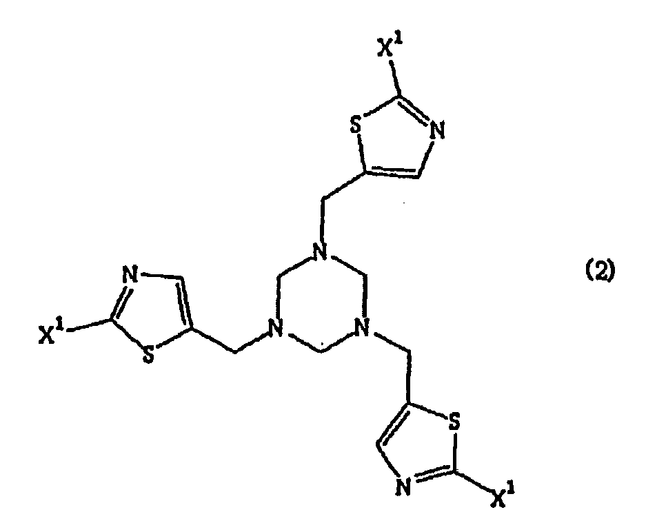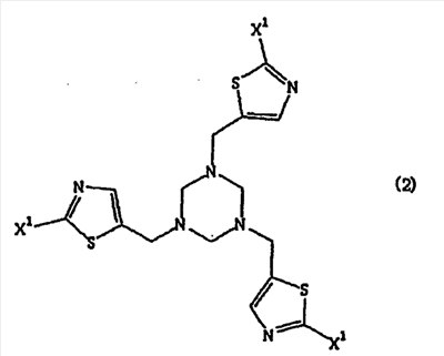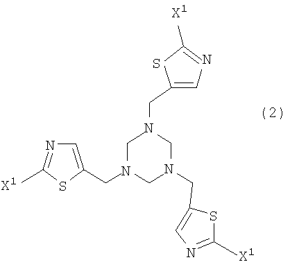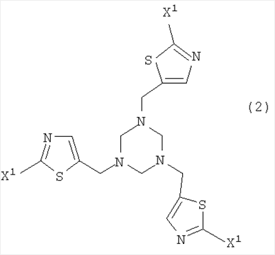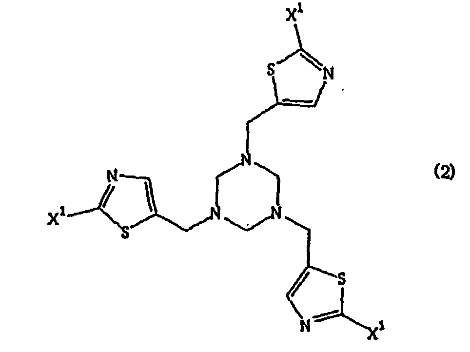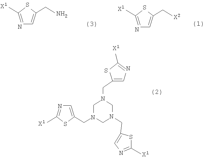Примеры таким образом получаемого гексакидротриазинового соединения (2) включают 1,3,5-трис[(тиазол-5-ил)метил]-1,3,5-гексагидротриазин, 1,3,5-трис[(2-хлортиазол-5-ил)метил]-1,3,5-гексагидротриазин, 1,3,5-трис[(2-бромтиазол-5-ил)метил]-1,3,5-гексагидротриазин и т.д.