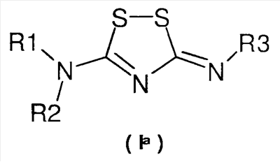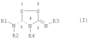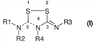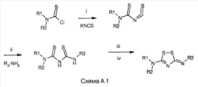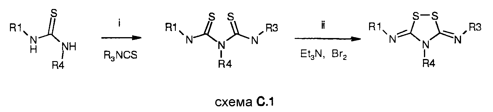 Настоящее изобретение относится к производным 5-имино-5Н-[1,2,4]-дитиазол-3-ил-амина и [1,2,4]-дитиазолидин-3,5-диилиден-диамина в качестве индукторов глутатион-S-трансферазы (GST) и NADPH:хинон-оксидоредуктазы (NQO), к способам получения этих соединений и к новым промежуточным соединениям, полезным в синтезе упомянутых производных [1,2,4]-дитиазоли(ди)на. Изобретение также относится к применению соединения, раскрываемого в этой заявке, для получения (производства) лекарственного средства, дающего благоприятный (положительный) эффект. Положительный эффект раскрыт в этой заявке или очевиден специалисту в данной области из описания и известных знаний в данной области. Изобретение также относится к применению соединения изобретения для получения (производства) лекарственного средства для лечения или предупреждения заболевания или состояния. Конкретнее, изобретение относится к новому применению для лечения заболевания или состояния, раскрытому в этой заявке или очевидному для специалиста в данной области из описания и известных знаний в данной области. В вариантах осуществления изобретения конкретные соединения со специфическим механизмом действия, раскрытые в этой заявке, применяют для получения лекарственного средства, полезного для профилактики и лечения неблагоприятных состояний, связанных с цитотоксичностью в целом и апоптозом в частности. Апоптоз сильно связан с морфогенезом и гистогенезом в процессе развития, и вовлечен в поддержание гомеостаза и в био-защиту (защитную реакцию), и представляет собой гибель клетки, имеющую важную роль в поддержании продолжительности жизни индивидуума. Когда процесс гибели, регулируемый генами, нарушен врожденно или после рождения, апоптоз является чрезмерно индуцированным или ингибированным, что вызывает функциональные нарушения в различных органах и, соответственно, заболевания. Лекарства, показывающие ингибирующую активность в отношении апоптоза, могут быть использованы в качестве средств профилактики и лечения заболеваний, которые, как полагают, обусловлены активизацией апоптоза. Целью настоящего изобретения было разработать анти-апоптические соединения с механизмами действия, отличающимися от любых механизмов действия, известных в данной области. Неожиданно было обнаружено, что производные [1,2,4]-дитиазоли(ди)на являются индукторами глутатион-S-трансферазы (GST), NADPH:хинон-оксидоредуктазы (NQO) и других ферментов при контролировании (регулировании) «антиоксидант-респонсивного элемента» (ARE). Полное регулирование активности таких ферментов может иметь положительные эффекты в лечении нейродегенеративных заболеваний и других заболеваний, в которых решающую роль играют обусловленные свободными радикалами дистрофия клетки и/или гибель клетки. Изобретение относится к соединениям общей формулы (I): в которой пунктирные линии между атомом углерода номер 5 и соседними с ним атомами азота представляют одинарную или двойную связи, при условии, что одна из этих двух связей представляет собой одинарную связь и другая представляет собой двойную связь, и при условии, что, когда двойная связь находится между атомом углерода номер 5 и атомом азота номер 4, R4 отсутствует, и, когда двойная связь находится между атомом углерода номер 5 и атомом азота в экзо-положении, R2 отсутствует, R1, R2, R3 и R4 незав