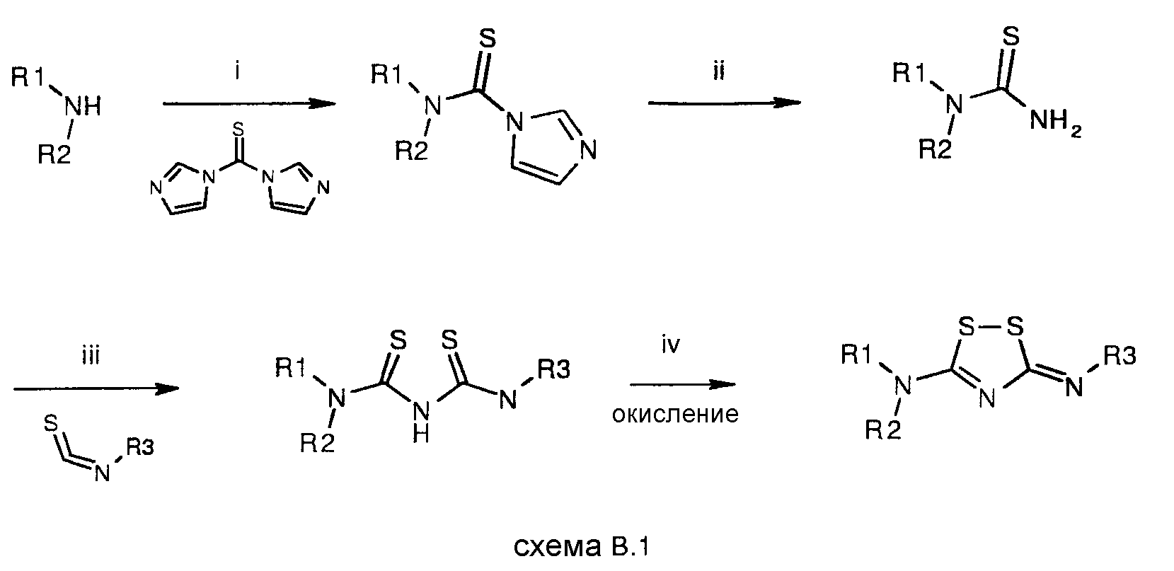 (во всех случаях соединения получают в виде свободных оснований, за исключением А1, которое получают в виде соли йодистоводородной кислоты (моно-гидройодида). Используемые сокращения обозначают: Ме = метил; Ph = фенил; Et = этил; But = бутил; i-Pr = изо-пропил;) ПУТЬ СИНТЕЗА В: Соединение В4: Методика В (схема В.1) стадии i+ii: 10 граммов (56 ммоль) тиокарбонилдиимидазола растворяют в тетрагидрофуране (THF) (400 мл). Добавляют 4,78 граммов (56 ммоль) пиперидина и перемешивают при 50°С в течение 3 часов. Смесь частично концентрируют и потом смешивают с 500 мл 7н. раствора NH3 в метаноле, после чего ее помещают в герметизированный сосуд на всю ночь при 45°С. При комнатной температуре реакционную смесь частично концентрируют, после этого ее охлаждают. Осадок, содержащий производное тиомочевины, собирают и сушат, что дает 1,3 г (16%) в виде серого твердого вещества. Методика В (схема В.1) стадии iii+iv: 1 грамм (6,85 ммоль) производного мочевины предыдущей стадии растворяют в 40 мл ацетонитрила, после чего добавляют 500 мг порошкообразного КОН и смесь перемешивают в течение 30 минут при комнатной температуре. Потом добавляют 1,02 грамма (6,85 ммоль) 2-метилфенилизотиоцианата и реакционную смесь перемешивают в течение 2 часов. Смесь фильтруют и фильтрат концентрируют. Получающееся в результате масло растворяют в этаноле (40 мл) и добавляют раствор 6,7 граммов йода и 8,4 граммов йодида калия в 20 мл воды до тех пор, пока раствор не изменит свой цвет. Перемешивание продолжают в течение 1 часа, после этого реакционную смесь фильтруют, остаток промывают водой, 2М раствором КОН и вновь водой. Потом остаток промывают диэтиловым эфиром и оставляют сохнуть, что дает 781 миллиграмм (39%) свободного основания В4 в виде не совсем белого твердого вещества. Температура плавления (t.пл.) 104,3-112,2°С (DSC – метод дифференциальной сканирующей калориметрии). 1Н ЯМР (200 МГц, d6-DMSO) В соответствии с синтезом, приведенным выше, получают соединения В1-В16 (таблица В), общей формулы (1а):