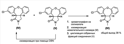 Как показано на Схеме II, нежелательное соотношение продуктов можно исправить путем последующей частичной изомеризации нежелательного цис-изомера (V) с преобразованием в транс-изомер (IV) с использованием 1,5-диазабицикло[4.3.0]нон-5-ена (DBN), с получением в результате термодинамически равновесного соотношения транс-изомера (IV) и цис-изомера (V), равного 1:2. Разделение транс-изомера (IV) и цис-изомера (V) осуществляют при помощи хроматографии на силикагеле. Цис-изомер (V) можно снова изомеризовать с использованием DBN с получением в результате 1:2 смеси соединения (IV) и соединения (V), из которой транс-изомер (IV) снова выделяют хроматографией. После еще одного повторения этого цикла в килограммовом масштабе перекристаллизация трех объединенных фракций транс-изомера (IV) дает транс-11-хлор-2,3,3a,12b-тетрагидро-2-метил-1H-дибенз[2,3:6,7]оксепино[4,5-c]пиррол-1-он (IV) с общим выходом примерно 38%, исходя из енамида (III).