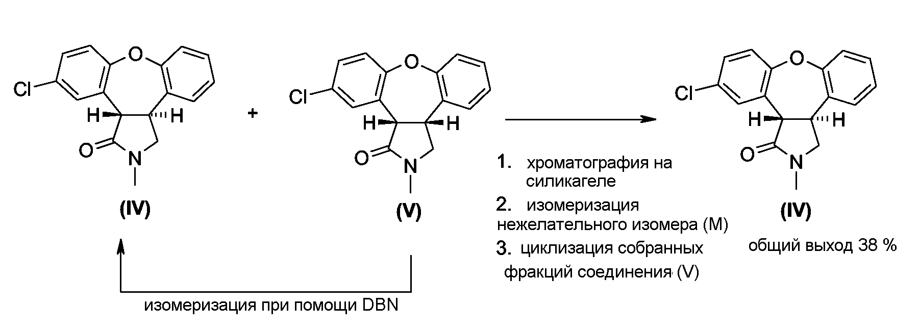 5-Диазабицикло[4,3,0]нон-5-ен (DBN, 1,6 л) добавляли к толуолу (400 л), содержащему смесь цис-изомера (V) и транс-изомера (IV) (всего 10 кг), и реакционную смесь перемешивали в течение 1 часа при 20°C. Добавляли воду (200 л) и pH водного слоя доводили до pH 4 при помощи уксусной кислоты (примерно 1,0 л). Перемешивание продолжали в течение 15 минут и, если это необходимо, добавляли уксусную кислоту для доведения pH до 4,0 (± 0,2). Слои разделяли. Толуольный слой промывали водой (200 л), концентрировали до объема 25 л и очищали при помощи хроматографии на силикагеле (100 кг) с использованием толуола (115 л) и толуол:этилацетата 95:5 об./об. (900 л). Фракции собирали и фракции, содержащие исключительно соединение транс-11-хлор-2,3,3a,12b-тетрагидро-2-метил-1H-дибенз[2,3:6,7]оксепино[4,5-c]пиррол-1-он (IV), объединяли и концентрировали до объема 50 л. Фракции, содержащие цис-11-хлор-2,3,3a,12b-тетрагидро-2-метил-1H-дибенз[2,3:6,7]оксепино[4,5-c]пиррол-1-он (V) или смеси транс-11-хлор-2,3,3a,12b-тетрагидро-2-метил-1H-дибенз[2,3:6,7]оксепино[4,5-c]пиррол-1-она (IV) и цис-11-хлор-2,3,3a,12b-тетрагидро-2-метил-1H-дибенз[2,3:6,7]оксепино[4,5-c]пиррол-1-она (V), объединяли.