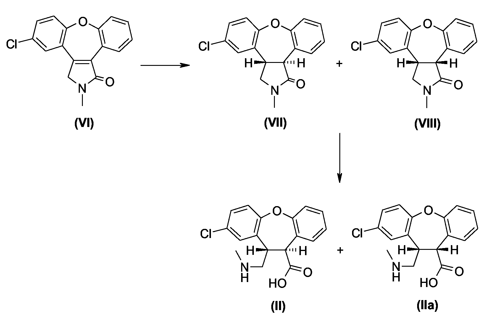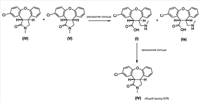 Настоящее изобретение обеспечивает способ (Схема III), в котором смесь лактамов, транс-11-хлор-2,3,3a,12b-тетрагидро-2-метил-1H-дибенз[2,3:6,7]-оксепино[4,5-c]пиррол-1-она (IV) и цис-11-хлор-2,3,3a,12b-тетрагидро-2-метил-1H-дибенз[2,3:6,7]-оксепино[4,5-c]пиррол-1-она (V), обрабатывают в спиртовом растворе, включающем избыточное количество сильного щелочного основания с получением, таким образом, смеси транс-8-хлор-10,11-дигидро-11-[(метиламино)-метил]-дибенз[b,f]оксепин-10-карбоновой кислоты (I) и цис-8-хлор-10,11-дигидро-11-[(метиламино)метил]-дибенз[b,f]оксепин-10-карбоновой кислоты (Ia). Реакция раскрытия кольца является стереоселективной, которая в результате дает 10:1 соотношение транс-изомера (I) и цис-изомера (Ia). Транс-аминокислотное производное (I) затем выделяют и циклизуют с получением транс-11-хлор-2,3,3a,12b-тетрагидро-2-метил-1H-дибенз[2,3:6,7]оксепино[4,5-c]пиррол-1-она (IV) с сохранением транс-стереохимии. Исходя из енамидного производного (III) выход транс-изомера (IV) составляет примерно 62%.