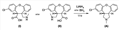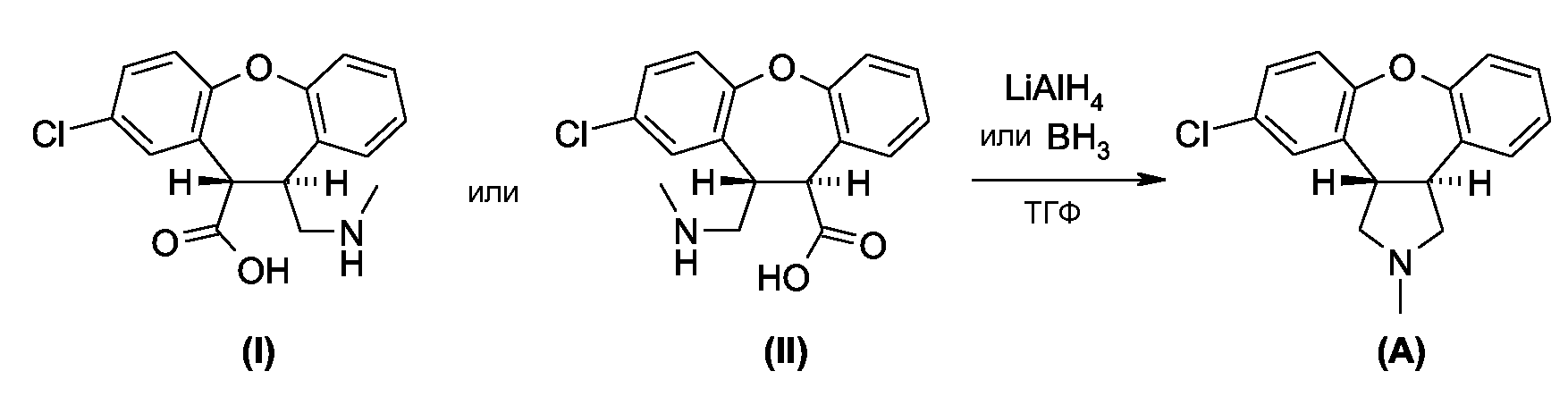 Хлорид алюминия (65,7 мг) добавляли по порциям к тетрагидрофурану (5 мл) при 0°C. При перемешивании медленно добавляли 10% раствор литийалюминийгидрида в тетрагидрофуране (1,35 мл), поддерживая при этом температуру ниже 10°C. Смесь охлаждали до 0°C и перемешивали в течение 15 минут. К смеси добавляли раствор транс-5-хлор-2,3,3a,12b-тетрагидро-2-метил-1H-дибенз[2,3:6,7]оксепино[4,5-c]пиррол-1-она (VII) (0,40 грамм) в тетрагидрофуране (4 мл), поддерживая при этом температуру ниже 15°C. Перемешивание продолжали в течение 2 часов при 10°C, после чего добавляли 0,5 н. раствор тартрата натрия (15 мл), поддерживая при этом температуру ниже 10°C. Перемешивание продолжали в течение 15 минут при 20°C. Солевой слой экстрагировали два раза смесью толуол:этилацетат (8:2) (25 мл). Объединенные органические слои сушили над сульфатом магния, фильтровали и упаривали в вакууме с получением 0,36 грамм (94%) транс-5-хлор-2,3,3a,12b-тетрагидро-2-метил-1H-дибенз[2,3:6,7]оксепино[4,5-c]пиррола (A).
