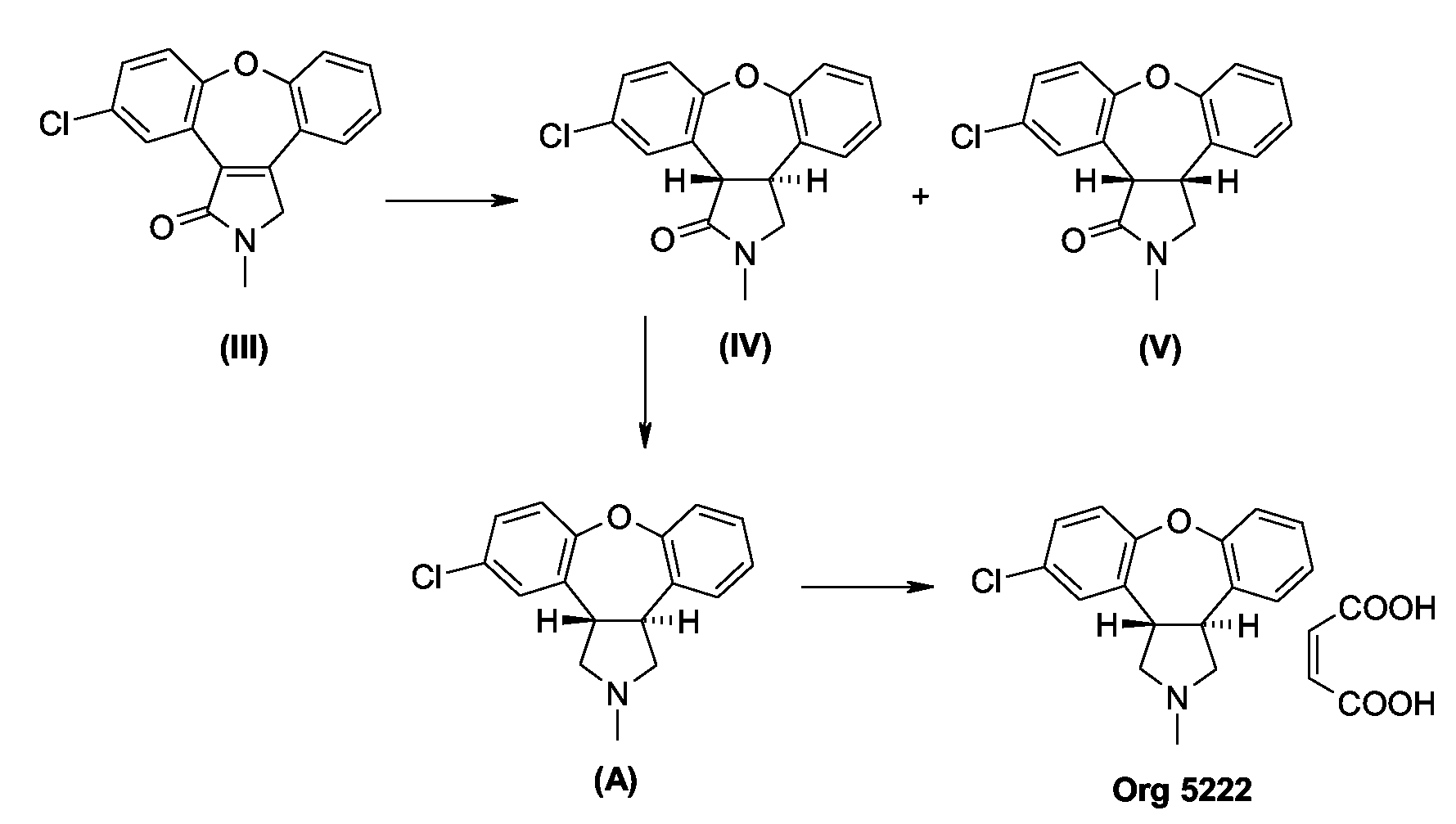 Транс-5-хлор-2-метил-2,3,3a,12b-тетрагидро-1H-дибенз[2,3:6,7]оксепино[4,5-c]пиррол, широко известный как азенапин, представляет собой соединение, обладающее активностью ЦНС-депресанта, а также обладающее антигистаминной и антисеротониновой активностью (см. патент США 4145434 на имя van den Burg). Были рассмотрены фармакологический профиль азенапина, его кинетика и метаболизм, и первые испытания его безопасности и эффективности для человека на добровольцах и пациентах с шизофренией (см. DeBoeretal., Drugs of the Future, 18(12), 1117-1123,1993). Было установлено, что малеатная соль азенапина, известная как Org 5222, представляет собой антагонист норадреналина и допамина с широким спектром действия и высокой активностью. Азенапин демонстрирует потенциальную антипсихотическую активность и может быть полезным для лечения депрессии (см. Международную Патентную Заявку WO 99/32108). Был описан фармацевтический препарат, подходящий для сублингвального или буккального введения азенапина малеата (см. Международную Патентную Заявку WO 95/23600). Азенапин малеат в настоящее время является объектом клинических исследований, что предполагает необходимость крупномасштабного синтеза этого лекарственного средства.