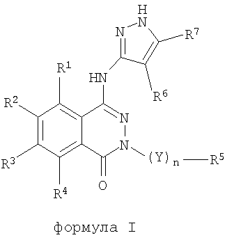 6. Соединения по п.5, представляющие собой 7-фтор-2-изопропил-4-(5-метил-1Н-пиразол-3-иламино)-2Н-фталазин-1-он; 2-изопропил-4-(5-метил-1Н-пиразол-3-иламино)-7-морфолино-2Н-фталазин-1-он; 2-бензил-4-(5-метил-1Н-пиразол-3-иламино)-7-морфолино-2Н-фталазин-1-он; 2-изопропил-7-(4-метилпиперазин-1-ил)-4-(5-метил-2Н-пиразол-3-иламино)-2Н-фталазин-1-он; 2-изопропил-4-(5-метил-1Н-пиразол-3-иламино)-7-диметиламино-2Н-фталазин-1-он; трет-бутиловый эфир [3-изопропил-1-(5-метил-2Н-пиразол-3-иламино)-4-оксо-3,4-дигидрофталазин-6-ил]метилкарбаминовой кислоты; 2-изопропил-4-(5-метил-1Н-пиразол-3-иламино)-7-метокси-2Н-фталазин-1-он; 2-изопропил-4-(5-метил-1Н-пиразол-3-иламино)-7-(пиридин-2-илметокси)-2Н-фталазин-1-он; 2-изопропил-4-(5-метил-1Н-пиразол-3-иламино)-7-(пиридин-3-илметокси)-2Н-фталазин-1-он; 2-изопропил-4-(5-метил-1Н-пиразол-3-иламино)-7-(пиридин-4-илметокси)-2Н-фталазин-1-он; 2-изопропил-4-(5-метил-1Н-пиразол-3-иламино)-7-(2-морфолин-4-илэтокси)-2Н-фталазин-1-он; 7-гидрокси-2-изопропил-4-(5-метил-1Н-пиразол-3-иламино)-2Н-фталазин-1-он; 2-бензил-7-метокси-4-(5-метил-1Н-пиразол-3-иламино)-2Н-фталазин-1-он; 2-изопропил-4-(5-метил-1Н-пиразол-3-иламино)-7-метилсульфанил-2Н-фталазин-1-он; 2-изопропил-7-метансульфонил-4-(5-метил-1Н-пиразол-3-иламино)-2Н-фталазин-1-он; 2-изопропил-4-(5-метил-1Н-пиразол-3-иламино)-7-(2-морфолин-4-илэтилсульфанил)-2Н-фталазин-1-он; 2-изопропил-7-[метил-(2-морфолин-4-илэтил)амино]-4-(5-метил-1Н-пиразол-3-иламино)-2Н-фталазин-1-он; 2-изопропил-4-(5-метил-1Н-пиразол-3-иламино)-7-(метилпиридин-4-илметиламино)-2Н-фталазин-1-он; 2-изопропил-4-(5-метил-1Н-пиразол-3-иламино)-7-(метилпиридин-3-илметиламино)-2Н-фталазин-1-он; 2-изопропил-4-(5-метил-1Н-пиразол-3-иламино)-7-(метилпиридин-2-илметиламино)-2Н-фталазин-1-он; N-[3-изопропил-1-(5-метил-1Н-пиразол-3-иламино)-4-оксо-3,4-дигидрофталазин-6-ил]-N-метилацетамид; 3-изопропил-1-[3-изопропил-1-(5-метил-1Н-пиразол-3-иламино)-4-оксо-3,4-дигидрофталазин-6-ил]-1-метилмочевина; этиловый эфир [3-изопропил-1-(5-метил-1Н-пиразол-3-иламино)-4-оксо-3,4-дигидрофталазин-6-ил]метилкарбаминовой кислоты; N-[3-изопропил-1-(5-метил-1Н-пиразол-3-иламино)-4-оксо-3,4-дигидрофталазин-6-ил]ацетамид; 7-[(4-фторбензил)метиламино]-2-изопропил-4-(5-метил-1Н-пиразол-3-иламино)-2Н-фталазин-1-он; N-[3-изопропил-1-(5-метил-1Н-пиразол-3-иламино)-4-оксо-3,4-дигидрофталазин-6-ил]-N-метилметансульфонамид; 2-изопропил-4-(5-метил-1Н-пиразол-3-иламино)-7-(2-морфолин-4-илэтиламино)-2Н-фталазин-1-он; 2-изопропил-7-метиламино-4-(5-метил-1Н-пиразол-3-иламино)-2Н-фталазин-1-он; 1-[3-изопропил-1-(5-метил-1Н-пиразол-3-иламино)-4-оксо-3,4-дигидрофталазин-6-ил]-3-метилмочевина; 4-(5-циклопропил-2Н-пиразол-3-иламино)-7-диметиламино-2-изопропил-2Н-фталазин-1-он; N-[3-изопропил-1-(5-метил-1Н-пиразол-3-иламино)-4-оксо-3,4-дигидрофталазин-6-ил]метансульфонамид; 2-изопропил-7-метоксиметил-4-(5-метил-1Н-пиразол-3-иламино)-2Н-фталазин-1-он; 2-бензил-7-метоксиметил-4-(5-метил-1Н-пиразол-3-иламино)-2Н-фталазин-1-он; 2-изопропил-7-(4-метилпиперазин-1-илметил)-4-(5-метил-1Н-пиразол-3-иламино)-2Н-фталазин-1-он; 2-изопропил-4-(5-метил-1Н-пиразол-3-иламино)-7-морфолин-4-илметил-2Н-фталазин-1-он; 3-изопропил-1-(5-метил-1Н-пиразол-3-иламино)-4-оксо-3,4-дигидрофталазин-6-карбоновая кислота; 2-изопропил-4-(5-метил-1Н-пиразол-3-иламино)-7-(морфолин-4-карбонил)-2Н-фталазин-1-он; диэтиламид 3-изопропил-1-(5-метил-1Н-пиразол-3-иламино)-4-оксо-3,4-дигидрофталазин-6-карбоновой кислоты; метоксиамид 3-изопропил-1-(5-метил-1Н-пиразол-3-иламино)-4-оксо-3,4-дигидрофталазин-6-карбоновой кислоты; изопропиламид 3-изопропил-1-(5-метил-1Н-пиразол-3-иламино