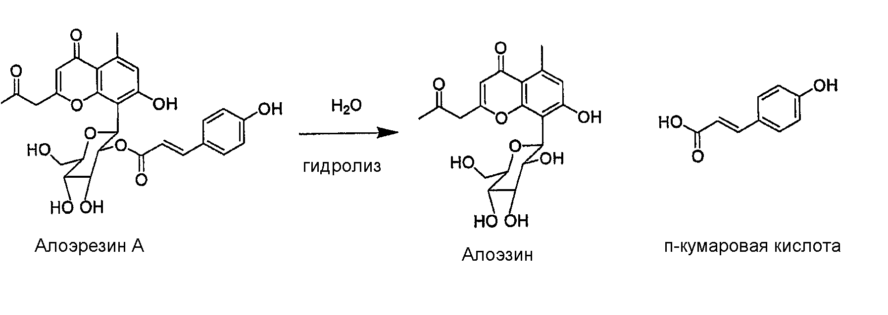 Изобретение относится к способу гидролитического превращения алоэрезина А в алоэзин экстракцией алоэзина из горькой настойки алоэ из растения алоэ и включает следующие стадии: гидролиз алоэрезина А в горькой настойке алоэ до алоэзина и п-кумаровой кислоты; и селективная экстракция из горькой настойки алоэ природного алоэзина и алоэзина, полученного из алоэрезина А. Доступное для экстракции из сока растений алоэ количество алоэзина таким образом увеличивается, и экстракция и очистка алоэзина также становится более легкой и менее дорогой. Поскольку алоэзин имеет большее коммерческое значение по сравнению с алоэрезином А, способ также увеличивает коммерческую ценность сока или горькой настойки алоэ из растения алоэ. Способ также необязательно включает отделение алоэзина от п-кумаровой кислоты. Типичными стадиями гидролиза, которые применяются в способе, являются кислотный гидролиз, гидролиз с помощью основания и ферментативный гидролиз. В случае кислотного гидролиза кислота представляет собой любую подходящую органическую или неорганическую кислоту, такую как соляная кислота, серная кислота, азотная кислота или фосфорная кислота. В случае ферментативного гидролиза гидролитический фермент обычно представляет собой эстеразу, липазу или протеазу. 29 з.п. ф-лы.