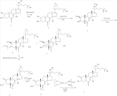 20-Гидроксиэкдизон 2 был превращен в 20,22-ацетонид 3, затем – в 2-ацетат 4. При его окислении пиридинийхлорхроматом образуется смесь 3-кетона 5 и соединения 6. Выделенный с помощью колоночной хроматографии кетон 5 изомеризуется в растворе MeOH – СНCl3 в присутствии SiO2, превращаясь в 3-эпи-ацетат-2-кетон 7. Его кислотный гидролиз (деблокирование 20,22-гидроксигрупп) дает соединение 8, а последующий гидролиз ацетата 8 в этаноле в присутствии ацетата гуанидина приводит к целевому соединению 1. Выход экдистероида 1 в данном 6-стадийном синтезе составил 7% в расчете на исходный 20-гидроксиэкдизон 2. Полученный таким образом экдистероид 1 представлял собой аморфный продукт, для него не были определены температура плавления и удельный угол оптического вращения.