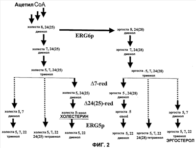 Некоторое количество генетических изменений у fungus могут быть осуществлены для того, чтобы изменить естественный метаболический путь получения эргостерола таким образом, чтобы продуцировался холестерин. Настоящее изобретение касается таким образом генетически модифицированного организма царства Fungi, экспрессирующего ферменты 7-дегидрохолестерин редуктазу и 3 -гидроксистерин 24-редуктазу. Измененный таким образом штамм организма царства Fungi продуцирует холестерин. Заявитель смог составить модель благодаря полученным результатам (см. экспериментальную часть настоящей заявки), пути метаболизма, приводящего к эргостеролу и к некоторым из его производных (см., фиг.2). Экспрессия ферментов 7-дегидрохолестерин-редуктазы и 3 -гидроксистерин 24-редуктазы у fungus S. cerevisiae может обеспечить продукцию холестерина, частично изменяя путь биосинтеза эргостерола.