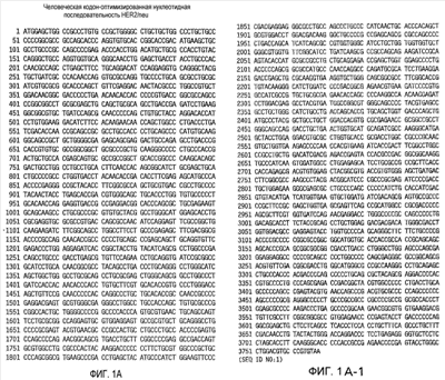 На фиг.1 показана нуклеотидная последовательность кодон-оптимизированного полинуклеотида (hHER2.opt, SEQ ID NO:1), которая кодирует человеческий белок HER2. См. пример 1. На панели В показана установленная аминокислотная последовательность человеческого белка HER2 (SEQ ID NO:2).