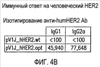 Сыворотки для титрования антител получали взятием крови позади глазничного сплетения. ELISA планшеты (Nunc Maxisorp , Roskilde, Denmark) оставляли покрытыми козьими анти-человеческими Fc-специфичными IgG (Pierce; каталожный номер 31123) на ночь при 4°С при концентрации 2 мкг/мл в 50мМ NaHCO3 (pH 9,6). Избыток антитела удаляли и неспецифичное связывание блокировали инкубацией в течение 60 мин при 37°С в PBBST5 буфере (BSA 5%, Твин 0,05%). После промывки добавляли супернатант IgB2-клеток в условиях окрашивания и инкубировали при комнатной температуре в течение 2 часов (Chen et al., J Biol Chem 271(13):7620-9 (1996)). IgB2-клетки (любезно предоставленные Dr. Y. Yarden, Weizmann Institute of Science, Rehovot, Israel) представляли собой НЕК-293 клетки, секретирующие димерный слитый белок, образованный внеклеточным доменом HER2 и Fc частью человеческого Ig. Планшеты промывали и последовательно разбавленные сыворотки (от 1:4000 до 1:25600) в PBBST1 буфере (BSA 1%, Твин 0,05%) инкубировали в течение ночи при 4°С. Сыворотки, собранные до иммунизации, использовали в качестве фона. Промывку выполняли в PBBST1. Вторичное антитело (AP-конъюгированные козьи анти-мышиные IgG1 или IgG2a (Pharmingen, 557272 и 553389)) разбавляли 1:40000 в PBBST5 и инкубировали 2-3 часа при комнатной температуре на шейкере. После промывки планшеты проявляли инкубацией с Sigma 106 субстратом для фосфатазы (Sigma; каталожный номер А106) в диэтаноламине. Планшеты считывали при помощи автоматизированного устройства считывания ELISA (Labsistems Multiskan Bichromatic, Helsinki, Finland) и результаты выражали в виде А=А405nm-A620nm. Для каждого образца вычитали фоновый сигнал, детектируемый в сыворотке, собранной до иммунизации.