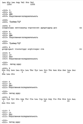 Кроме того, многие раковые пациенты, страдающие от злокачественных опухолей, ассоциированных со сверхэкспрессией HER2/neu, имели иммунные ответы на белок HER2. Анти-hHER2 цитотоксические Т лимфоциты (CTL) были выделены у пациентов с раком молочной железы и яичников (Ioannides et al., Cell Immunol 151(1):225-34 (1993); Peoples et al., Proc Natl Acad Sci USA 92(14):6547-51 (1995)). Были определены некоторые HLA-A2.1-ассоциированные пептиды hHER2, и пептид-специфичные Т-клетки могут быть генерированы in vitro (Fisk et al., Cancer Res 57(1):8-93 (1997); Yoshino et al., Cancer Res 54(13):3387-90 (1994); Lustgarten et al., Hum Immunol 52(2):109-18 (1997)).