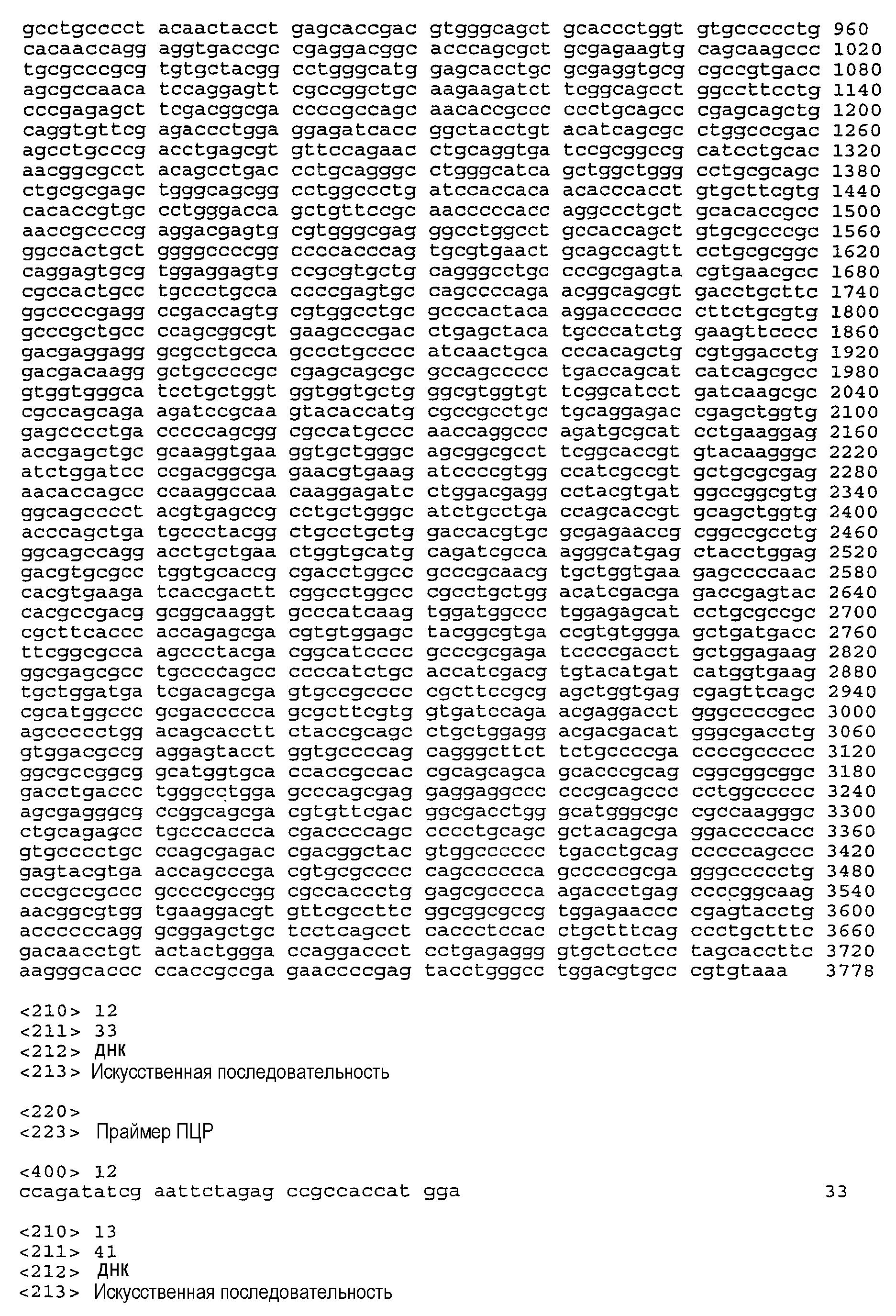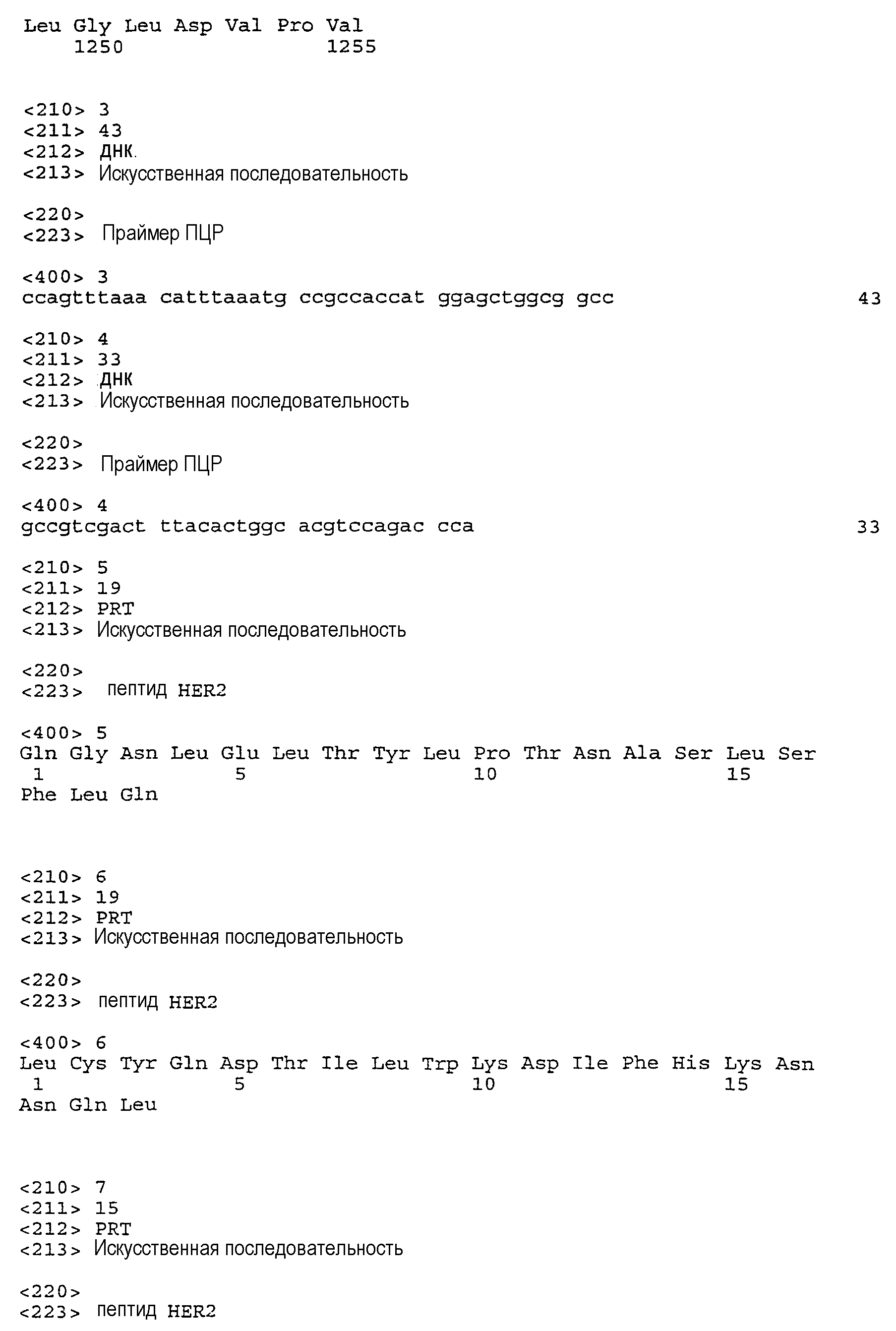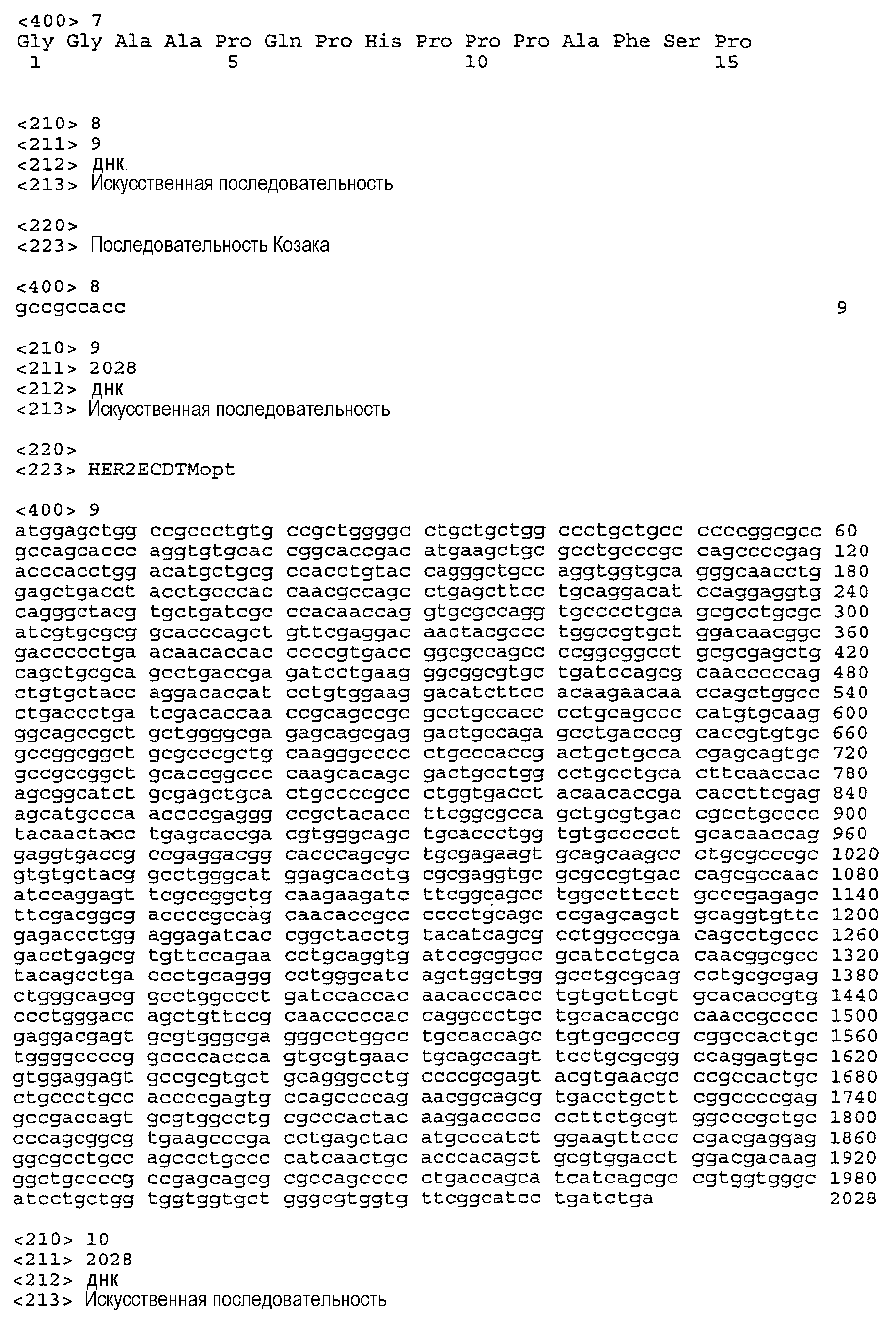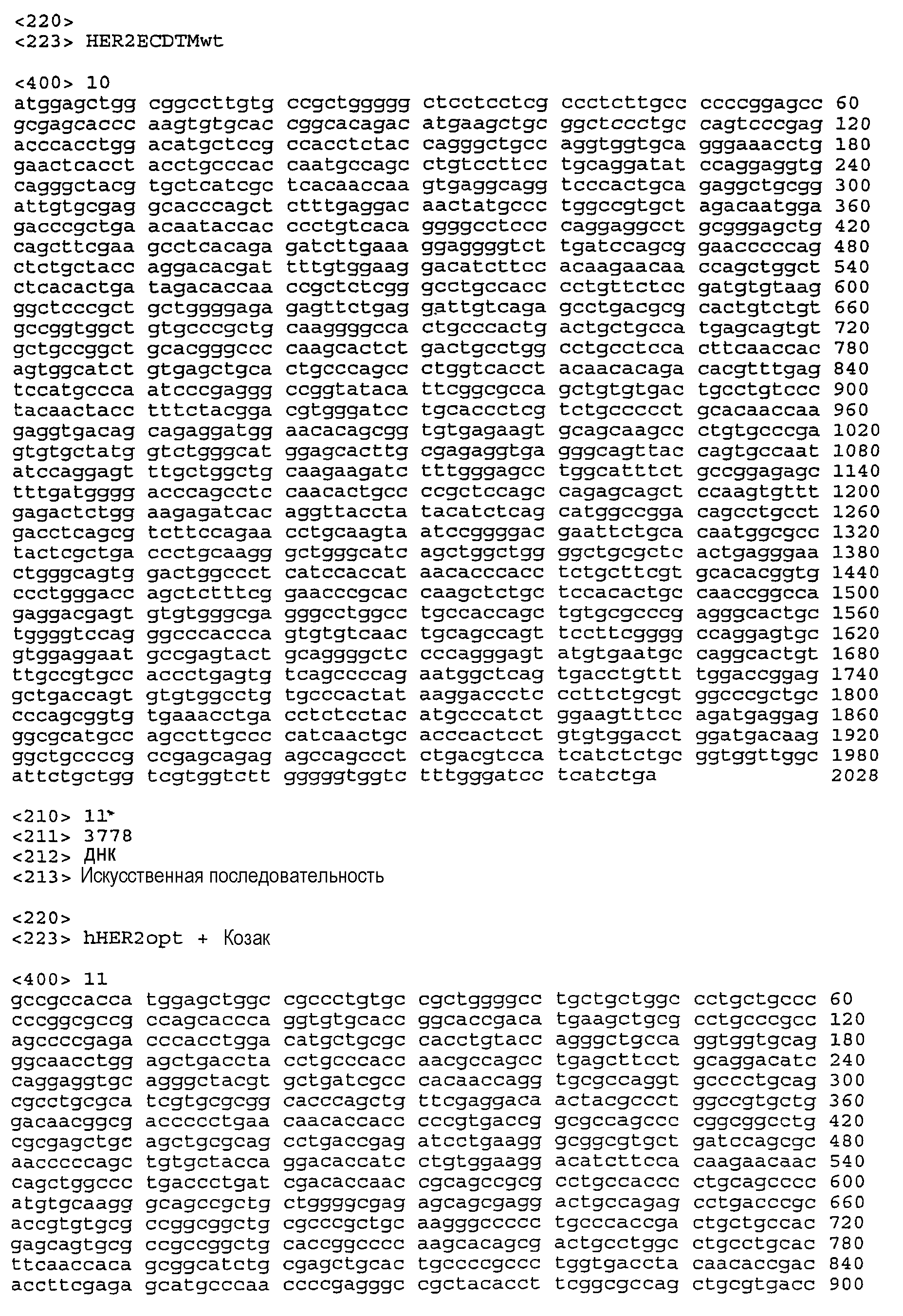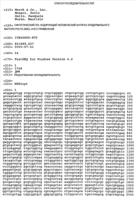 Предпочтительная молекула ДНК настоящего изобретения содержит нуклеотидную последовательность, раскрытую в настоящем изобретении как SEQ ID NO:1 (показанную на фиг.1), которая кодирует человеческий белок HER2, показанный на фиг.2 и приведенный в виде SEQ ID NO:2. Нуклеотидная последовательность, приведенная в SEQ ID NO:1, была кодон-оптимизирована для оптимальной экспрессии в человеческих клетках. Во избежание трудностей, связанных с ПЦР амплификацией, в этом варианте осуществления настоящего изобретения применена конструкция с менее жесткой оптимизацией для последовательности hHER2 между позициями 3601 и 3805, в которой уменьшено содержание GС при сохранении такой же аминокислотной композиции. См. пример 5.