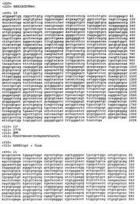 Синтетический ген человеческого HER2 (hHER2.opt, фиг.1) разрабатывали для включения кодонов, предпочтительных для человека (гуманизированных), для каждого аминокислотного (далее в настоящем описании аа) остатка. Во время сборки гена при амплификации посредством ПЦР постоянно делетировалась последовательность из 86 п.о., начиная с позиции 3642, из-за высокого GC содержания последовательности в этом участке. Для решения этой проблемы для последовательности hHER2 между позициями 3601 и 3805 выбирали конструкцию с менее жесткой оптимизацией, что уменьшало GC содержание, при этом сохраняя ту же самую аа композицию.