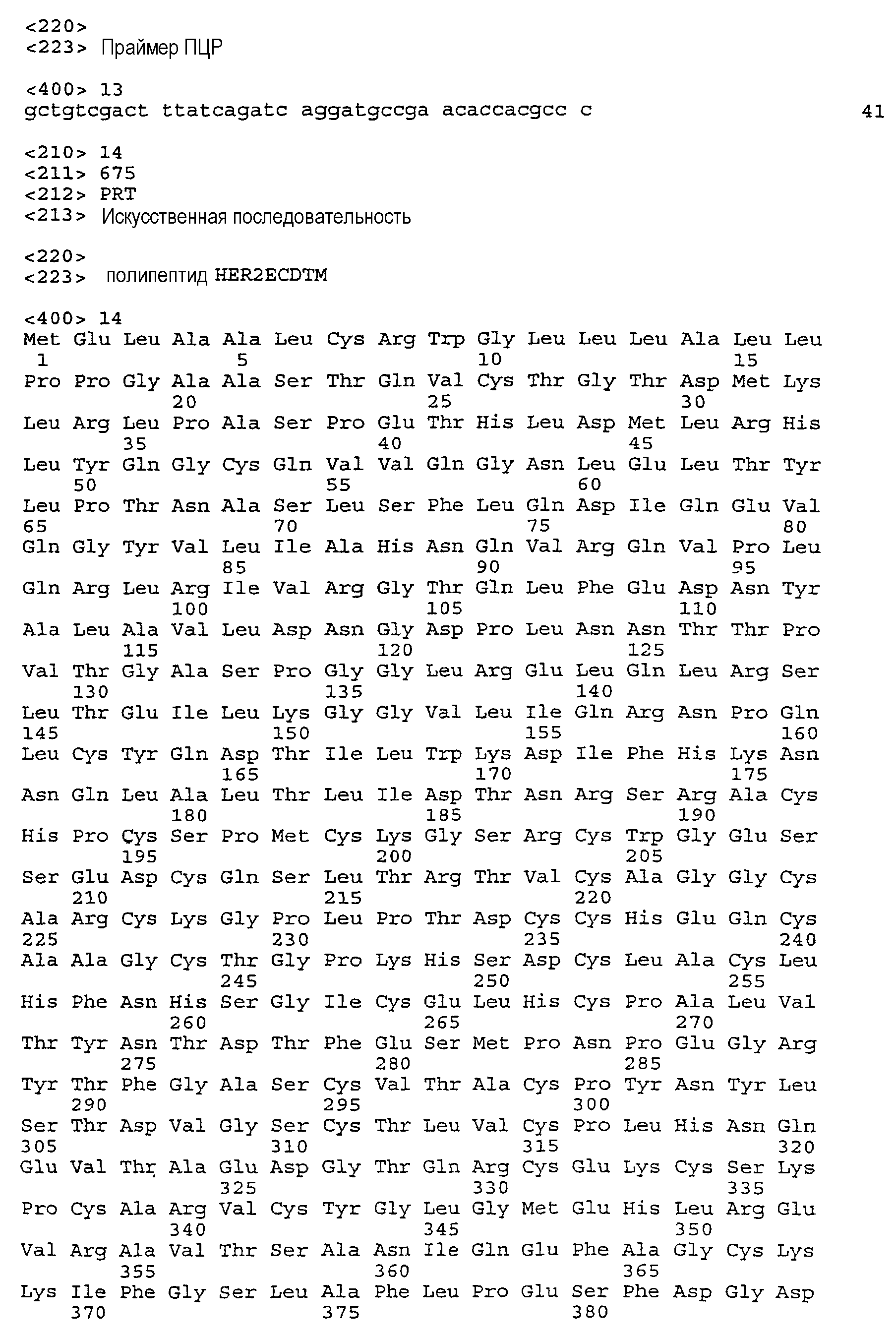 Другая предпочтительная молекула ДНК настоящего изобретения содержит нуклеотидную последовательность, раскрытую в настоящем описании в виде SEQ ID NO:9 (показанную на фиг.6А), которая кодирует человеческий белок HER2ECDTM, приведенный в виде SEQ ID NO:14. Нуклеотидная последовательность, приведенная в SEQ ID NO:9, была кодон-оптимизирована для оптимальной экспрессии в человеческих клетках.