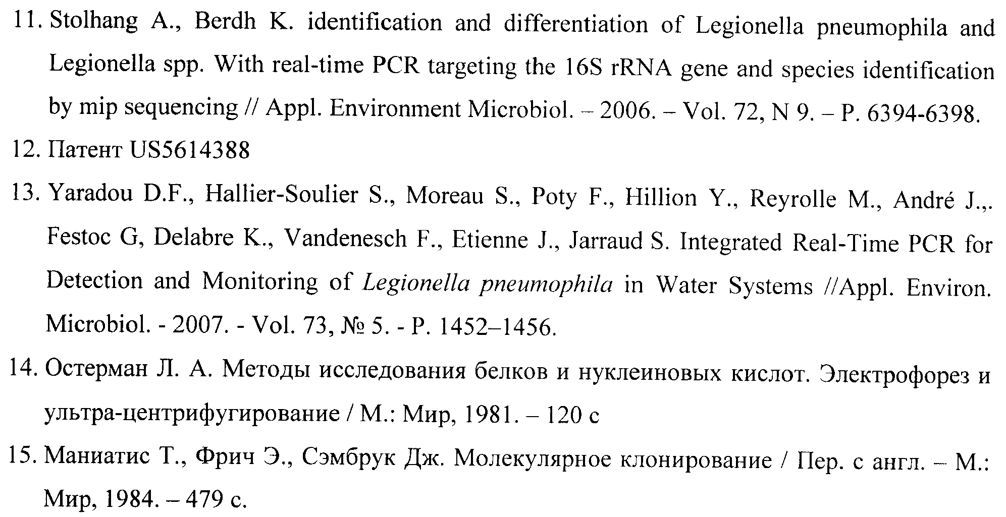 Известен коммерческий набор IQ-Check (BioRad) для скрининга легионелл в окружающей среде, сконструированный американскими исследователями (13). Однако описанный набор не предназначен для выявления возбудителя легионеллеза в биологическом материале (мокроте, бронхоальвеолярном лаваже, плевральной жидкости, мазках из ротоглотки, крови, микро- и макро-аутоптатов). Кроме того, высокая стоимость набора и невозможность выполнения с его помощью ПЦР с электрофоретическим учетом результатов ограничивают его применение в практических лабораториях, так как ПЦР с учетом результатов в режиме «реального времени» предусматривает использование дорогостоящего оборудования.