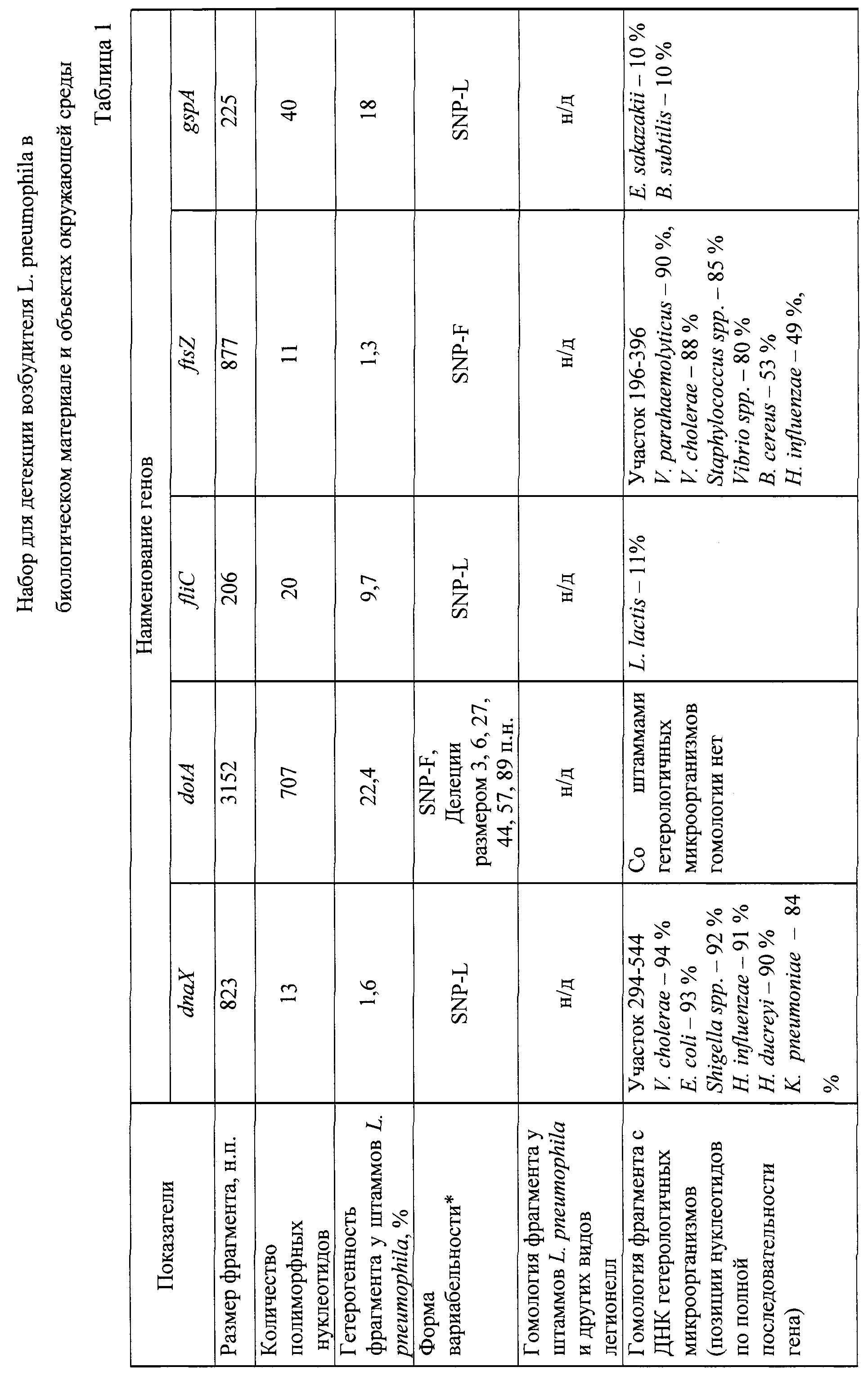 Изобретение относится к области биотехнологии. Задачей изобретения является создание набора для детекции возбудителя легионеллеза в биологическом материале и объектах окружающей среды с возможностью использования его в ПЦР с электрофоретическим и гибридизационно-флуоресцентным учетом результатов. Набор для детекции возбудителя L. pneumophila содержит видоспецифичные праймеры Lp1 – 5′-GCTTGGTGCTGTGAAAGGTА-3′, Lp2 – 5′-CCTCCAATAAAGGAGATGCAA-3′ и зонд Lp-з – 5′-ROX-TCACCGTACGCACATCCGCA-BHQ2-3′. ДНК-мишенью для специфической амплификации L. pneumophila является фрагмент ДНК гена fisZ, расположенный в пределах с 397 по 758 нуклеотид полной последовательности локуса. Изобретение обеспечивает быстрое и высокоспецифичное выявление L. pneumophila 1-14 серогрупп в клинических образцах и пробах окружающей среды. 2 ил., 6 табл.