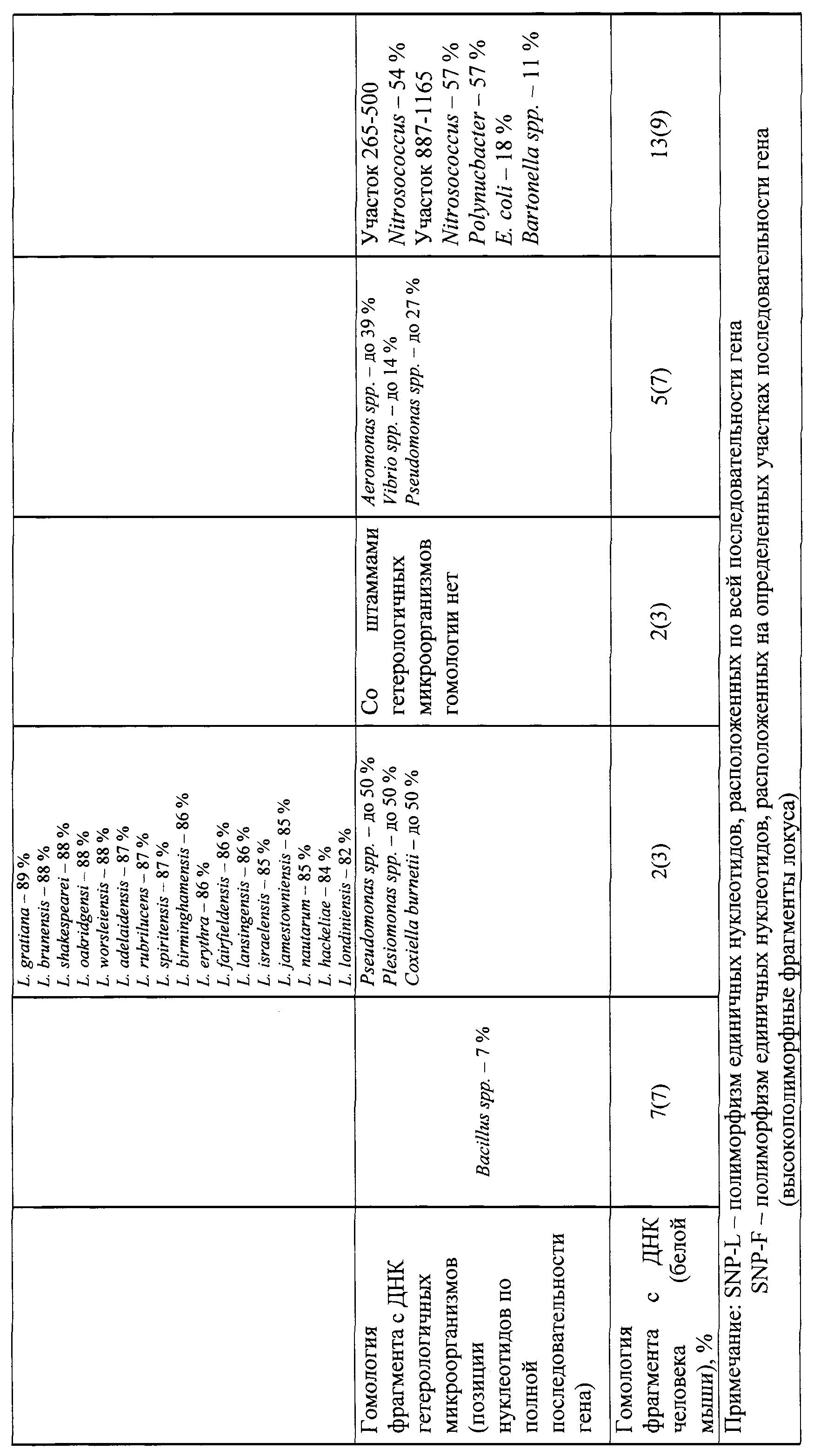 Известно использование в качестве мишеней для детекции Legionella spp. и L. pneumophila фрагментов генов mip, 16S рДНК, 5S рДНК, 23S-5S, dotA для ПЦР с учетом результатов методом электрофореза (ПЦР-ЭФ) (9, 10). Описанные мишени не обеспечивают достаточного уровня надежности для клинической диагностики легионеллеза при выполнении ПЦР-ЭФ (11).