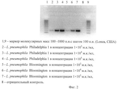 Для определения аналитической чувствительности ПЦР использовали количественно охарактеризованные разведения рекомбинантных плазмид с клонированным фрагментом гена ftsZ, а также препаратов ДНК, выделенных из проб, содержащих L. pneumophila различных серогрупп в концентрации 1×103-1×105 м.к./мл. Результаты представлены на фиг.1 и 2.