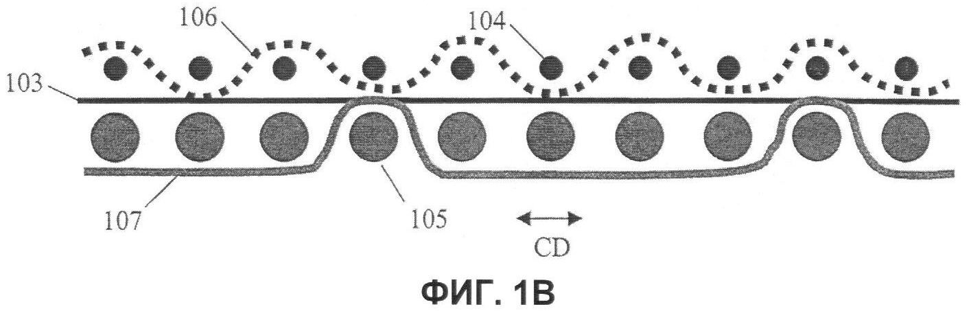 Фиг.1А представляет собой изображение поперечного сечения в направлении CD-нитей, на котором показаны траектории соединительных нитей первой системы CD-нитей для примера трехслойной ткани, содержащей формовочный слой, состоящий из MD-нитей 104, и слой стороны износа, состоящий из MD-нитей 105, в соответствии с настоящим изобретением. MD-нити формовочного слоя переплетаются в последовательности SSB-типа парой внутренних соединительных CD-нитей 101, 102, которые комбинируются с формированием простого тканого переплетения. Такое переплетение позволяет получать однородную поверхность и обеспечивать структурную устойчивость формовочного слоя. Как показано на чертеже, соединительная пара нитей находится внутри формовочного слоя, но просто соединяется со слоем стороны износа ткани.