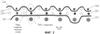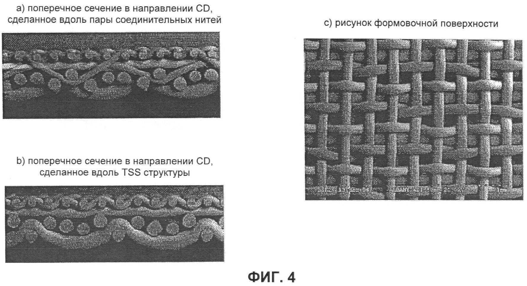 На Фиг.4 изображено: а) поперечное сечение в направлении CD-нитей, сделанное вдоль пары соединительных нитей, b) поперечное сечение в направлении CD-нитей, сделанное вдоль TSS-структуры, и с) рисунок формовочной поверхности примера трехслойной ткани, показанной на Фиг.1А, 1В и Фиг.2; и