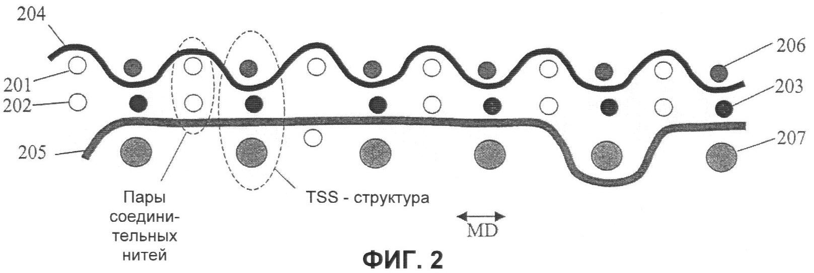 В соответствии с другими аспектами настоящего изобретения ткань может представлять собой трехслойную формовочную ткань; в этом случае первый слой представляет собой формовочный слой, а второй слой образует сторону износа ткани. Уточное соотношение в ткани может составлять 2:1, или представлять собой любое другое уточное соотношение, известное в настоящей области техники. По меньшей мере, некоторые из MD-нитей и CD-нитей могут представлять собой моноволоконные нити. Соединительная пара может быть переплетена как при помощи прямой прокидки челнока (straight pick configuration), так и при помощи обратной прокидки челнока (reverse pick configuration). Соединительная пара также может быть соткана в виде последовательности поддерживающих соединительных нитей (sheet support binder sequence – SSB-последовательности). Вторая система CD-нитей может образовывать структуру с трехрядным расположением уточных нитей (triple tacked shute structure – TSS-структуру). Некоторые из пятых CD-нитей могут образовывать длинные непересеченные отрезки на внешней стороне второго слоя. Третья CD-нить может быть изготовлена из другого материала и/или может иметь диаметр, отличный от диаметра четвертой и пятой CD-нитей. Третья CD-нить может находиться между первым и вторым слоем или может быть связана с одной или более MD-нитью второго слоя.